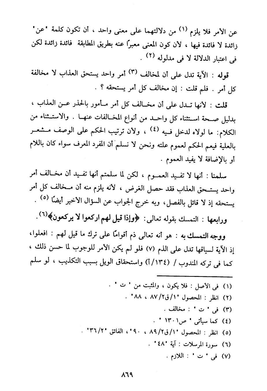 قلت: لأنها تدل على أن مخالف كل أمر مأمور بالحذر عن العذاب، بدليل صحة استثناء كل واحد من أنواع المخالفات عنها. والاستثناء من الكلام: ما لولاه لدخل فيه، ولأن ترتيب الحكم على الوصف مشعر بالعلية فيعم الحكم لعموم علته ونحن لا نسلم أن المفرد المعرف سواء كان باللام أو بالإضافة لا يفيد العموم.