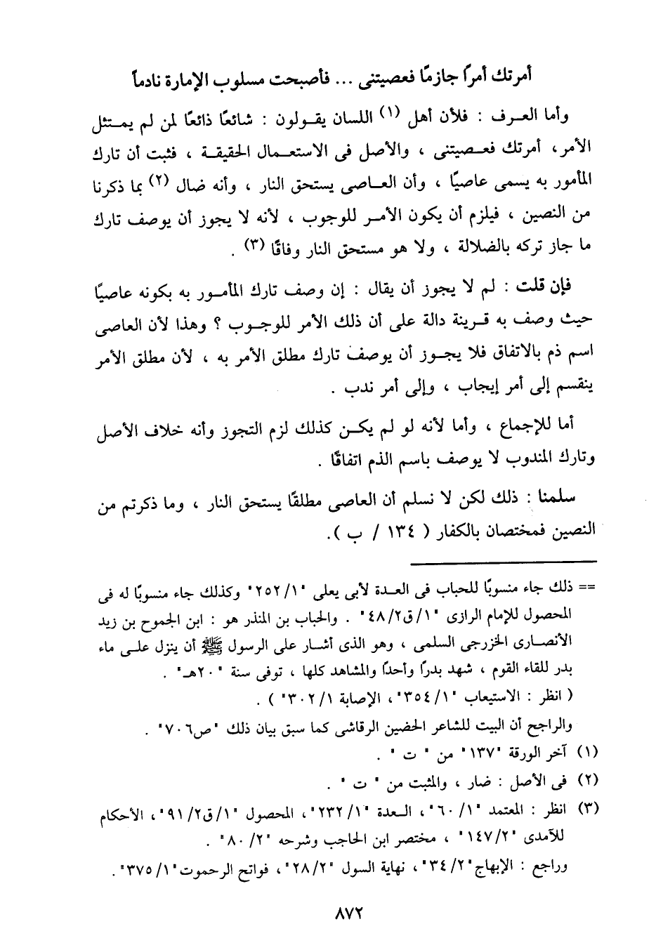 فإن قلت: لم لا يجوز أن يقال: إن وصف تارك المأمور به بكونه عاصيًا حيث وصف به قرينة دالة على أن ذلك الأمر للوجوب؟ وهذا لأن العاصي اسم ذم بالاتفاق فلا يجوز أن يوصف تارك مطلق الأمر به، لأن مطلق الأمر ينقسم إلى أمر إيجاب، وإلى أمر ندب.
