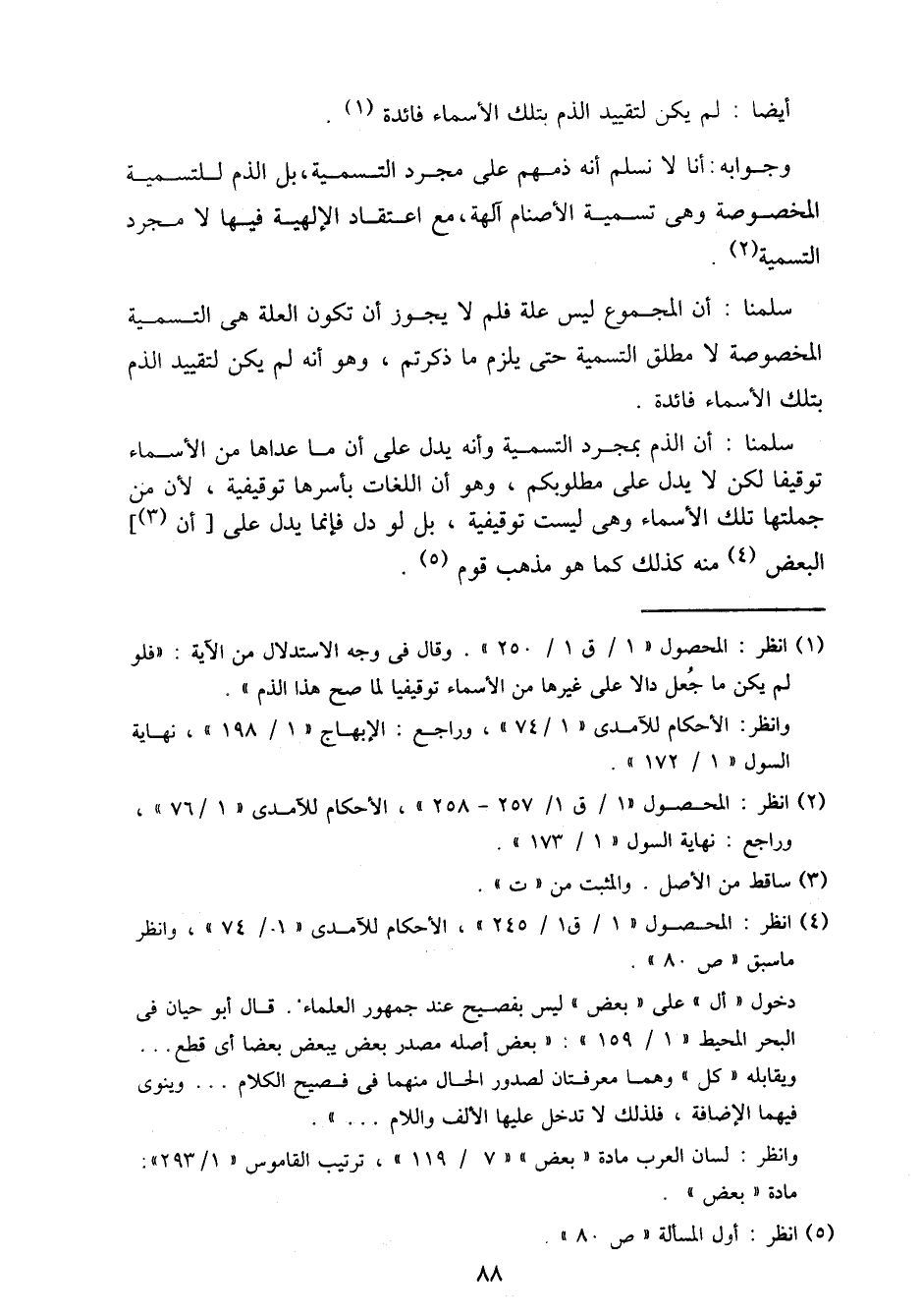 وجوابه: أنا لا نسلم أنه ذمهم على مجرد التسمية، بل الذم للتسمية المخصوصة وهي تسمية الأصنام آلهة، مع اعتقاد الإلهية فيها لا مجرد التسمية.