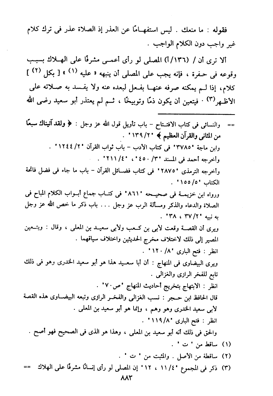 ألا ترى أن / (136/أ) المصلي لو رأي أعمي مشرفًا على الهلاك بسبب وقوعه في حفرة، فإنه يجب على المصلى أن ينبهه "عليه" [بكل] كلام، إذا لم يمكنه صرفه عنها بفعل لبعده عنه ولا يفسد به صلاته على الأظهر. فيتعين أن يكون ذمًا وتوبيخًا، ثم لم يعتذر أبو سعيد رضي الله