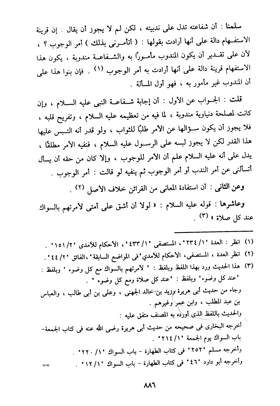وعاشرها: قوله عليه السلام: "لولا أن أشق على أمتي لأمرتهم بالسواك عند كل صلاة".