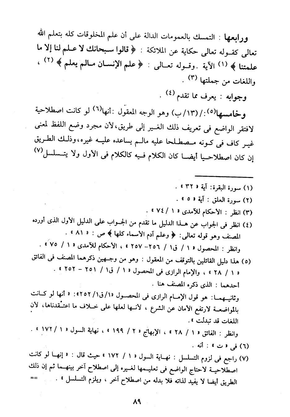 وخامسها: / (13/ب) وهو الوجه المعقول: أنها لو كانت اصطلاحية لافتقر الواضع في تعريف ذلك الغير إلى طريق، لأن مجرد وضع اللفظ لمعنى غير كاف في كونه مصطلحا عليه ما لم يساعده عليه غيره، وذلك الطريق إن كان اصطلاحيا أيضا كان الكلام فيه كالكلام في الأول ولا يتسلسل