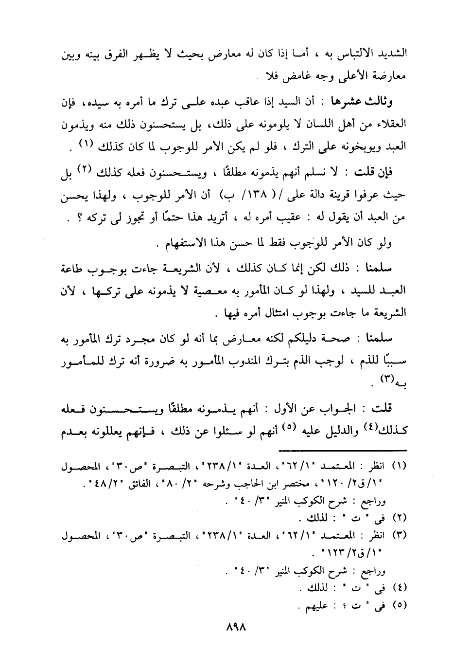 وثالث عشرها: أن السيد إذا عاقب عبده على ترك ما أمره به سيده، فإن العقلاء من أهل اللسان لا يلومونه على ذلك، بل يستحسنون ذلك منه ويذمون العبد ويوبخونه على الترك، فلو لم يكن الأمر للوجوب لما كان كذلك.