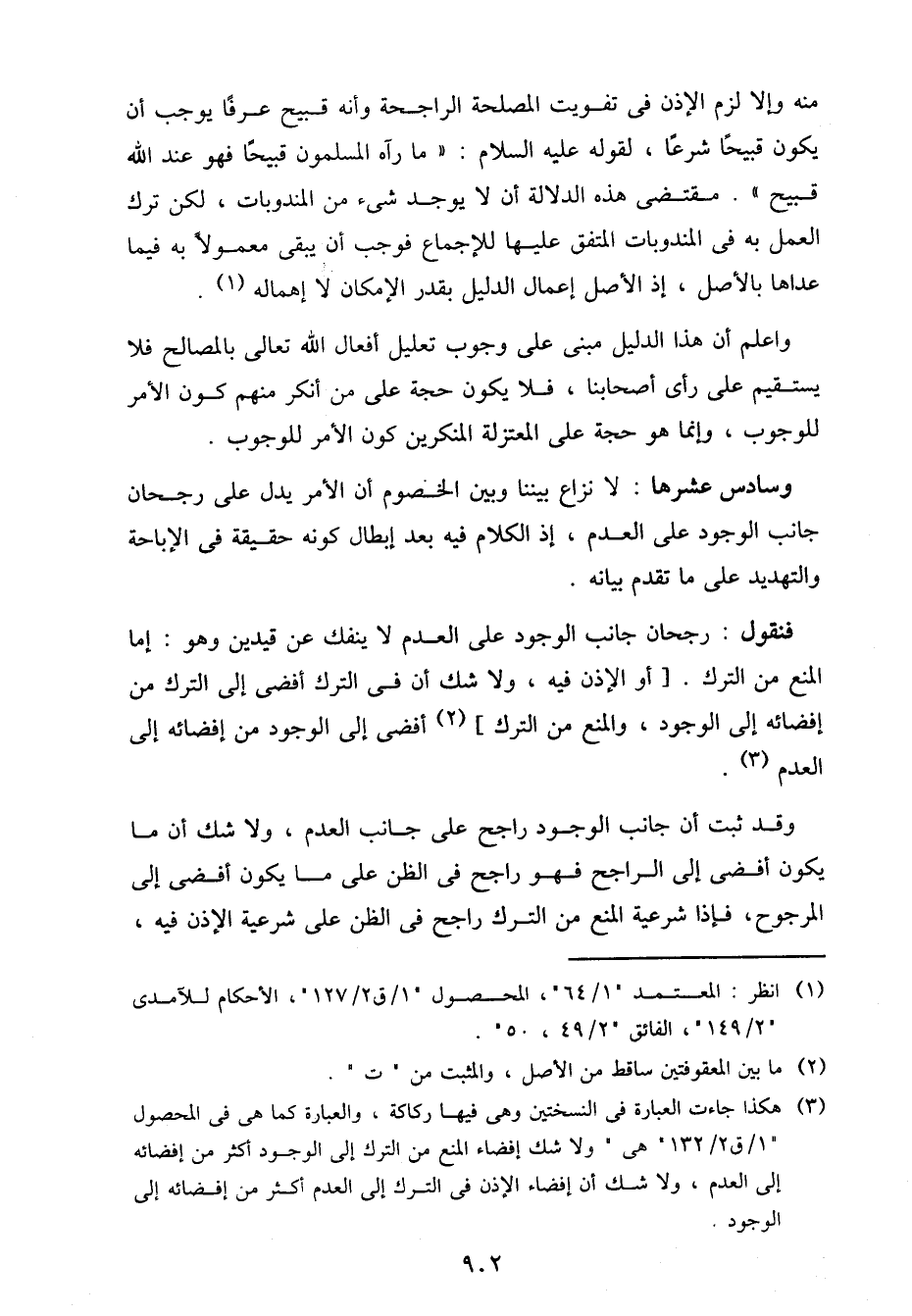 منه وإلا لزم الإذن في تفويت المصلحة الراجحة وأنه قبيح عرفًا يوجب أن يكون قبيحًا شرعًا، لقوله عليه السلام: "ما رآه المسلمون قبيحًا فهو عند الله قبيح". مقتضي هذه الدلالة أن لا يوجد شيء من المندوبات، لكن ترك العمل به في المندوبات المتفق عليها للإجماع فوجب أن يبقي معمولاً به فيما عداها بالأصل، إذ الأصل إعمال الدليل بقدر الإمكان لا إهماله.