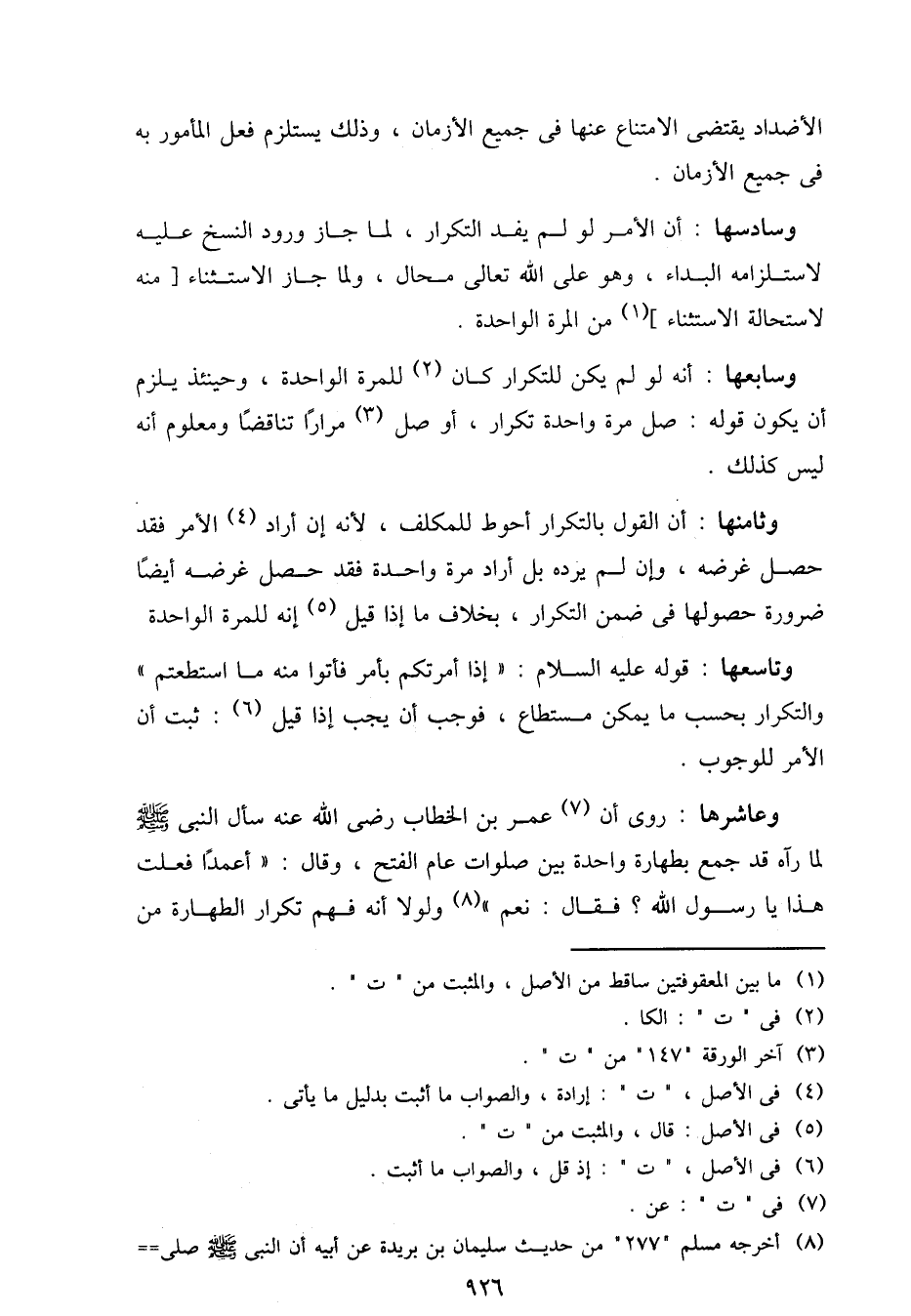 وسابعها: أنه لو لم يكن للتكرار كان للمرة الواحدة، وحينئذ يلزم أن يكون قوله: صل مرة واحدة تكرار، أو صل مرارًا تناقضًا ومعلوم أنه ليس كذلك.