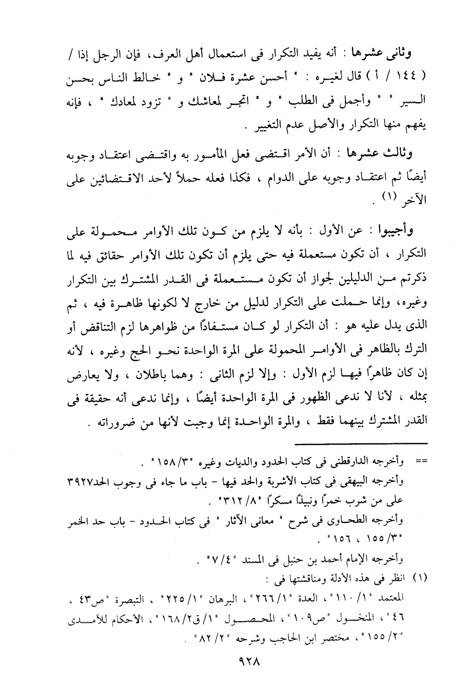 وثاني عشرها: أنه يفيد التكرار في استعمال أهل العرف، فإن الرجل إذا / (144/أ) قال لغيره: "أحسن عشرة فلان" و "خالط الناس بحسن السير" "وأجمل في الطلب" و "اتجر لمعاشك و "تزود لمعادك"، فإنه يفهم منها التكرار والأصل عدم التغيير.
