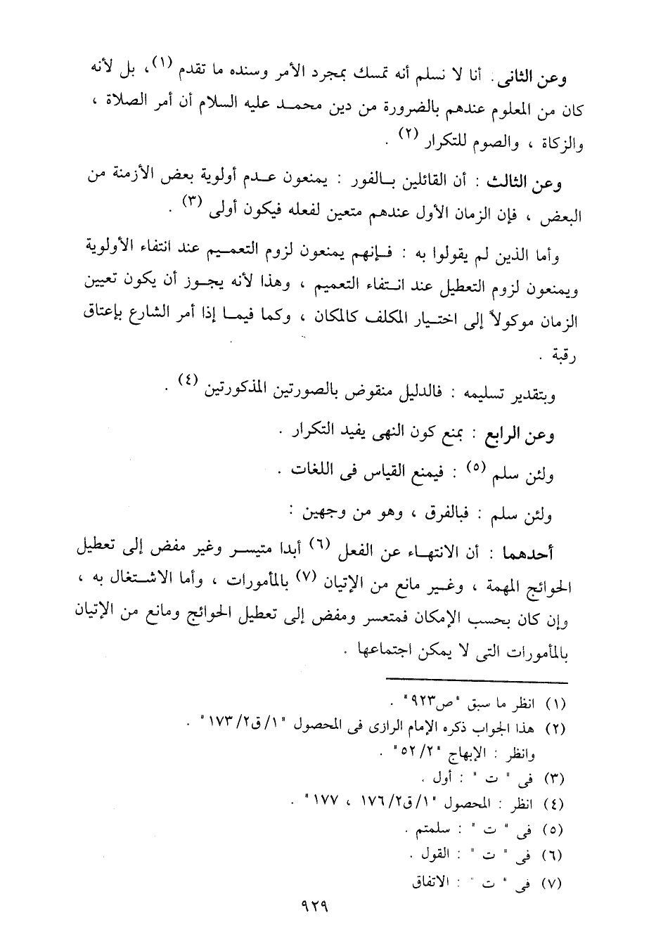 وعن الثالث: أن القائلين بالفور: يمنعون عدم أولوية بعض الأزمنة من البعض، فإن الزمان الأول عندهم متعين لفعله فيكون أولى.