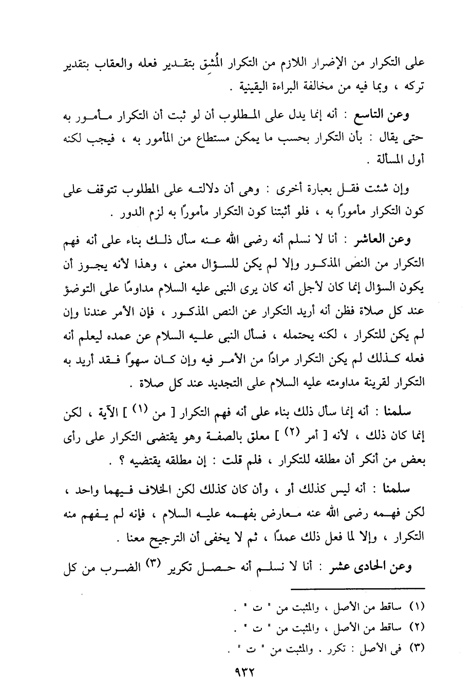 وعن التاسع: أنه إنما يدل على المطلوب أن لو ثبت أن التكرار مأمور به حتى يقال: بأن التكرار بحسب ما يمكن مستطاع من المأمور به، فيجب لكنه أول المسألة.