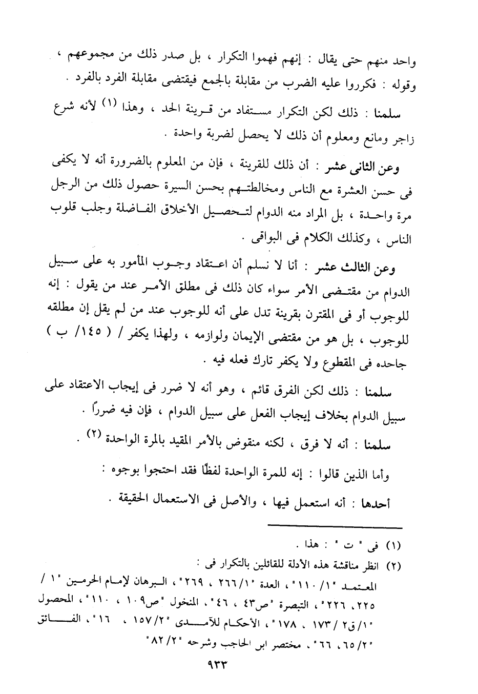 وعن الثالث عشر: أنا لا نسلم أن اعتقاد وجوب المأمور به على سبيل الدوام من مقتضي الأمر سواء كان ذلك في مطلق الأمر عند من يقول: إنه للوجوب أو في المقترن بقرينة تدل على أنه للوجوب عند من لم يقل إن مطلقه للوجوب، بل هو من مقتضى الإيمان ولوازمه، ولهذا يكفر / (145/ب) جاحده في المقطوع ولا يكفر تارك فعله فيه.