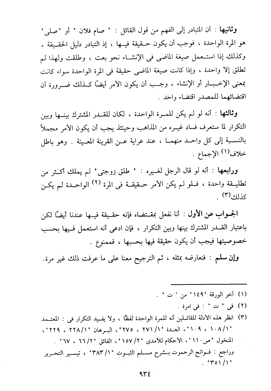 وثالثها: أنه لو لم يكن للمرة الواحدة، لكان للقدر المشترك بينها وبين التكرار لما ستعرف فساد غيره من المذاهب وحينئذ يجب أن يكون الأمر مجملاً بالنسبة إلى كل واحد منهما، عند عراية عن القرينة المعينة. وهو باطل خلاف الإجماع.