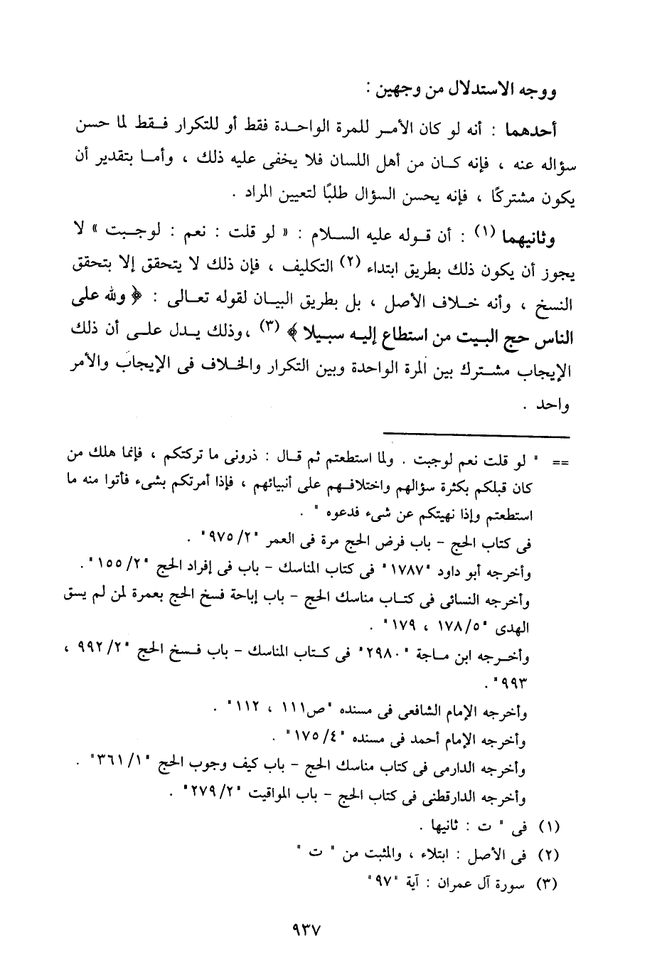 وثانيهما: أن قوله عليه السلام: "لو قلت: نعم: لوجبت" لا يجوز أن يكون ذلك بطريق ابتداء التكليف، فإن ذلك لا يتحقق إلا بتحقق النسخ، وأنه خلاف الأصل، بل بطريق البيان لقوله تعالى: {ولله على الناس حج البيت من استطاع إليه سبيلا}، وذلك يدل على أن ذلك الإيجاب مشترك بين المرة الواحدة وبين التكرار والخلاف في الإيجاب والأمر واحد.