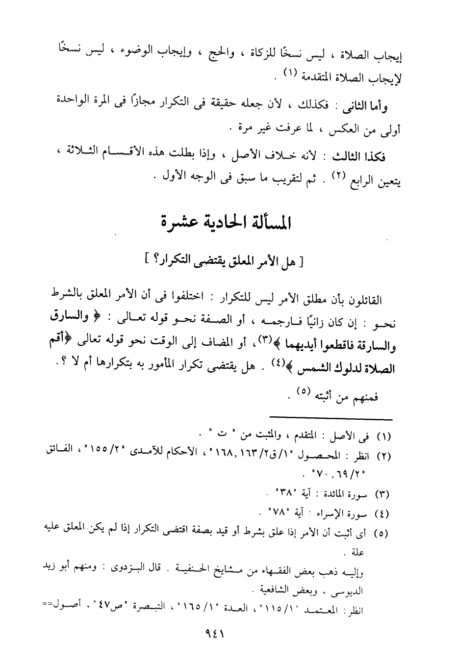 القائلون بأن مطلق الأمر ليس للتكرار: اختلفوا في أن الأمر المعلق بالشرط نحو: إن كان زانيًا فارجمه، أو الصفة نحو قوله تعالى: {والسارق والسارقة فاقطعوا أيديهما}، أو المضاف إلى الوقت نحو قوله تعالى {أقم الصلاة لدلوك الشمس}. هل يقتضي تكرار المأمور به بتكرارها أم لا؟. فمنهم من أثبته.