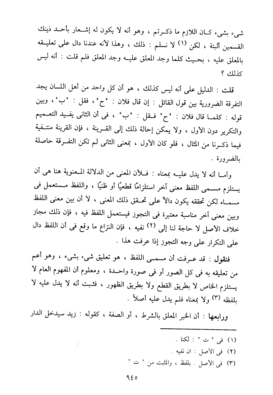 قلت: الدليل على أنه ليس كذلك، هو أن كل واحد من أهل اللسان يجد التفرقة الضرورية بين قول القائل: إن قال فلان: "ح"، فقل: "ب"، وبين قوله: كلما قال فلان: "ح" فقل: "ب"، في أن الثاني يفيد التعميم والتكرير دون الأول، ولا يمكن إحالة ذلك إلى القرينة، فإن القرينة منتفية فيما ذكرنا من المثال، فلو كان الأول، بمعنى الثاني لم تكن التفرقة حاصلة بالضرورة.