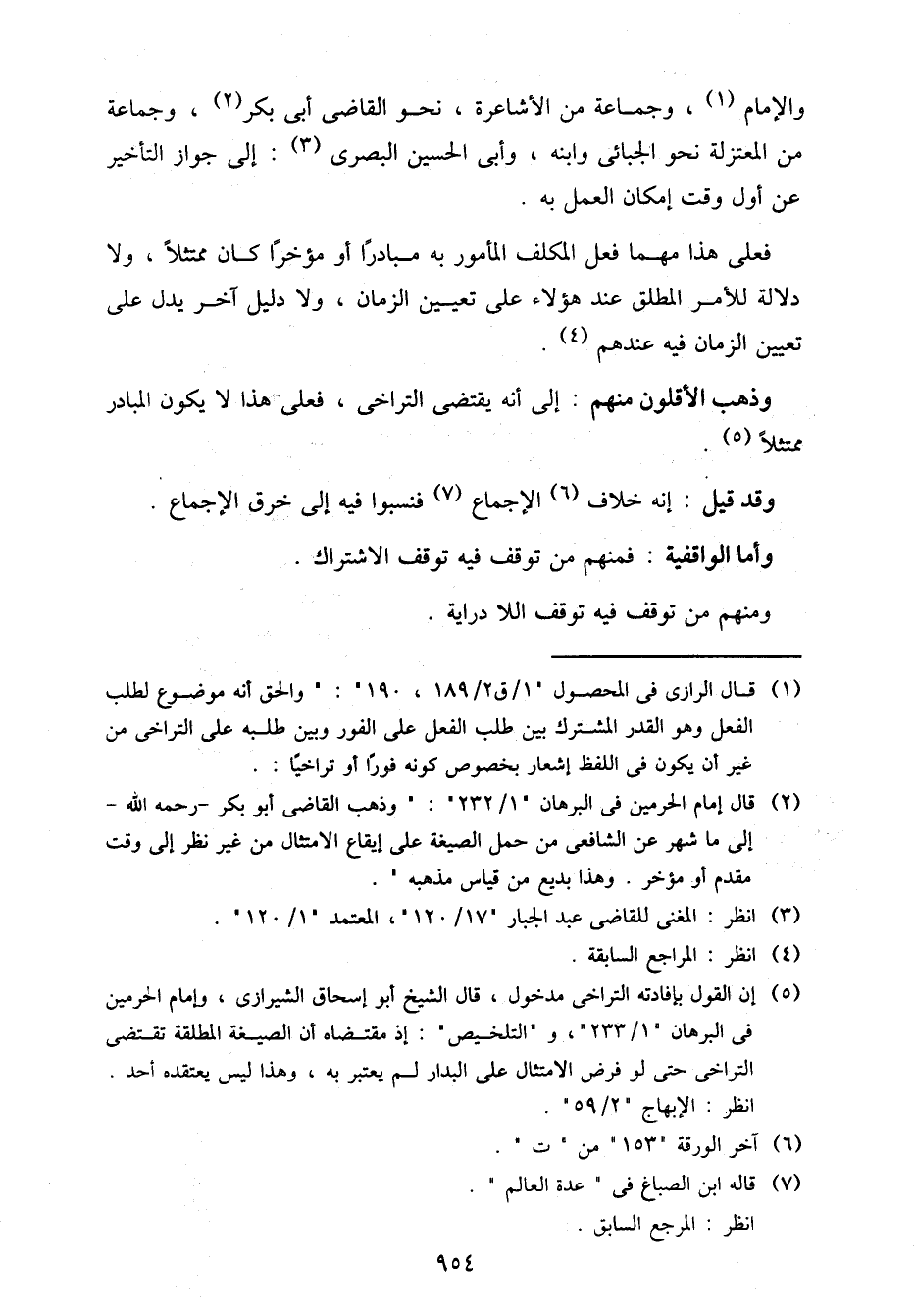 والإمام، وجماعة من الأشاعرة، نحو القاضي أبي بكر، وجماعة من المعتزلة نحو الجبائي وابنه، وأبي الحسين البصري: إلى جواز التأخير عن أول وقت إمكان العمل به.