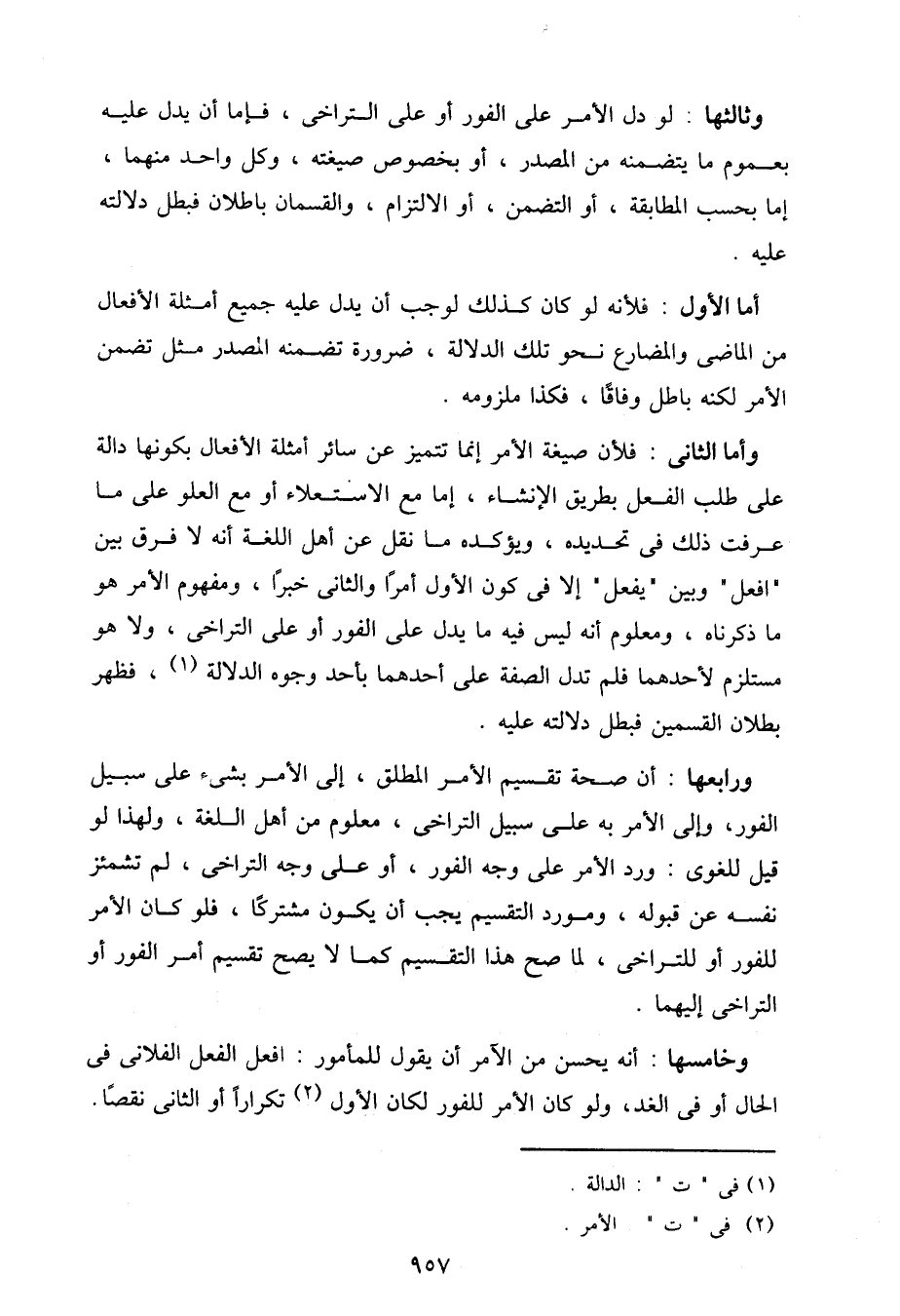 ورابعها: أن صحة تقسيم الأمر المطلق، إلى الأمر بشيء على سبيل الفور، وإلى الأمر به على سبيل التراخي، معلوم من أهل اللغة، ولهذا لو قيل للغوي: ورد الأمر على وجه الفور، أو على وجه التراخي، لم تشمئز نفسه عن قبوله، ومورد التقسيم يجب أن يكون مشتركًا، فلو كان الأمر للفور أو التراخي، لما صح هذا التقسيم كما لا يصح تقسيم أمر الفور أو التراخي إليهما.