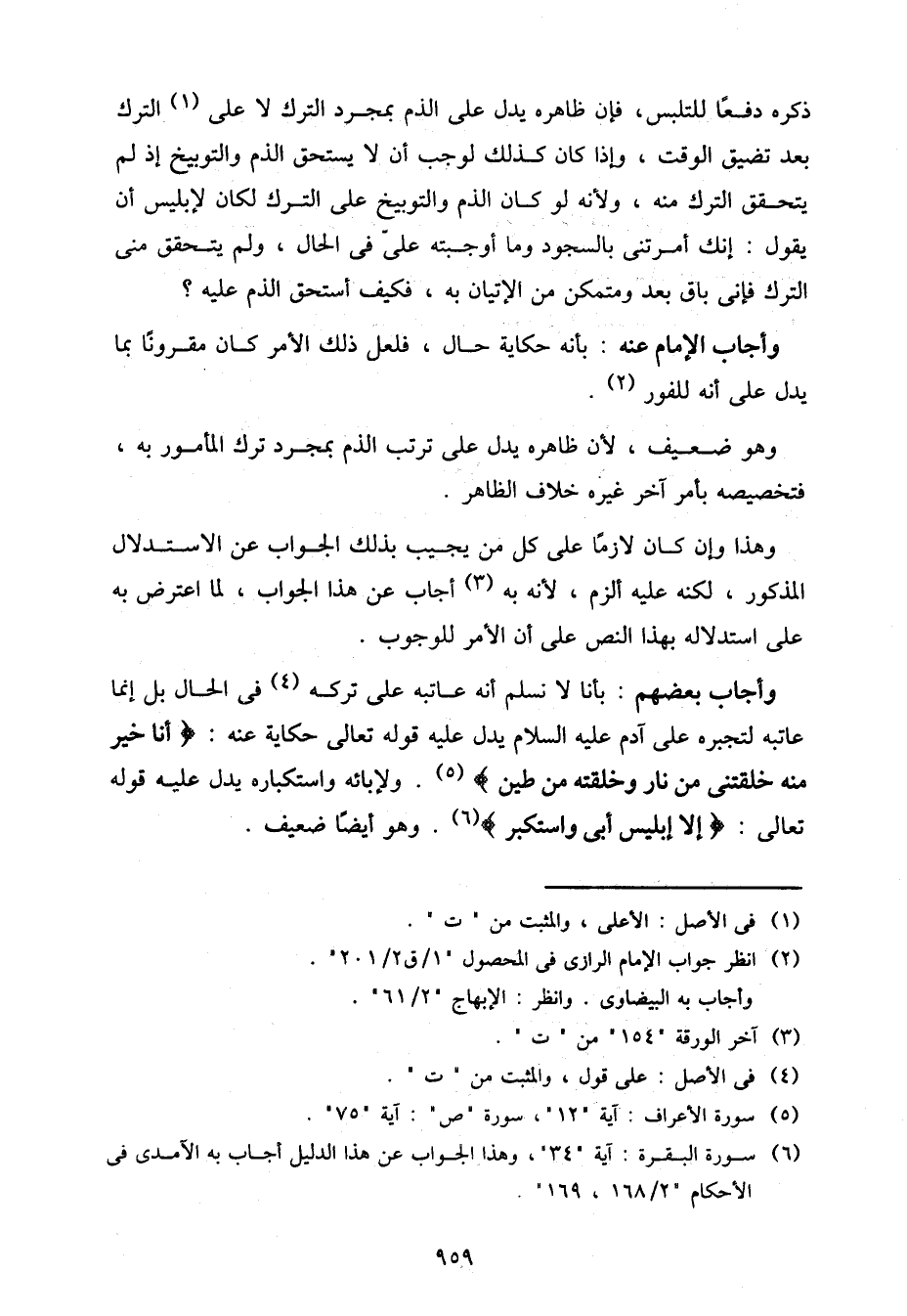 وأجاب بعضهم: بأنا لا نسلم أنه عاتبه على تركه في الحال بل إنما عاتبه لتجبره على آدم عليه السلام يدل عليه قوله تعالى حكاية عنه: {أنا خير منه خلقتني من نار وخلقته من طين}. ولإبائه واستكباره يدل عليه قوله تعالى: {إلا إبليس أبي واستكبر}. وهو أيضًا ضعيف.