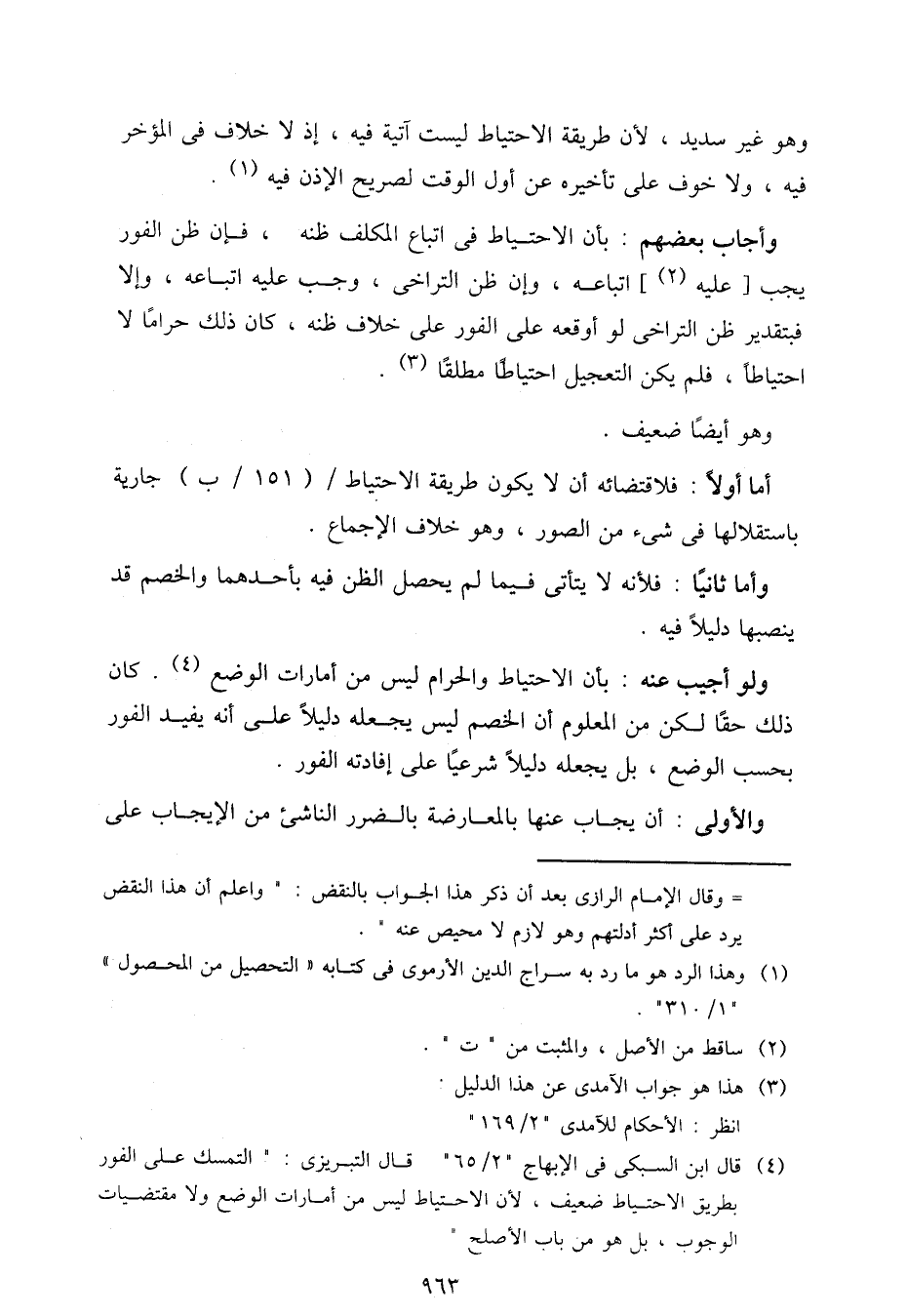 وأجاب بعضهم: بأن الاحتياط في إتباع المكلف ظنه، فإن ظن الفور يجب [عليه] إتباعه، وإن ظن التراخي، وجب عليه إتباعه، وإلا فبتقدير ظن التراخي لو أوقعه على الفور على خلاف ظنه، كان ذلك حرامًا لا احتياطًا، فلم يكن التعجيل احتياطًا مطلقًا.