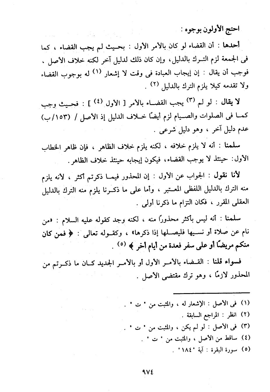 أحدها: أن القضاء لو كان بالأمر الأول: بحيث لم يجب القضاء، كما في الجمعة لزم الترك بالدليل، وإن كان ذلك لدليل آخر لكنه خلاف الأصل، فوجب أن يقال: إن إيجاب العبادة في وقت لا إشعار له بوجوب القضاء ولا تقدمه كيلا يلزم الترك بالدليل.