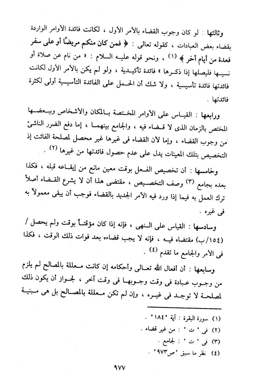 ورابعها: القياس على الأوامر المختصة بالمكان والأشخاص وببعضها المختص بالزمان الذي لا قضاء فيه، والجامع بينهما، إما دفع الضرر الناشئ من وجوب القضاء، وإما لأن القضاء في غيرها غير محصل لمصلحة الفائت إذ التخصيص بتلك المعينات يدل على عدم حصول فائدتها من غيرها.