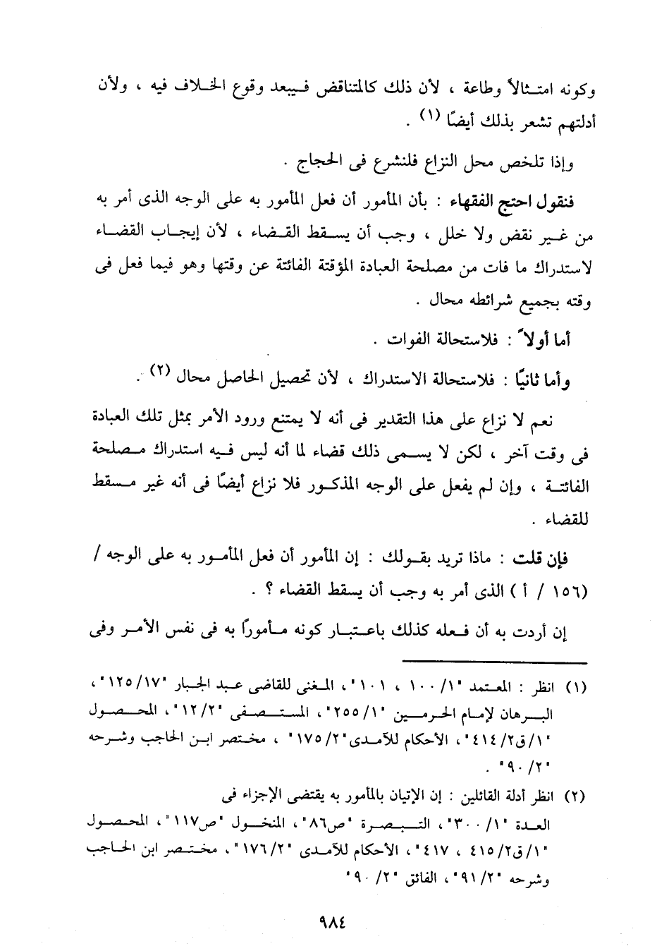 فنقول احتج الفقهاء: بأن المأمور أن فعل المأمور به على الوجه الذي أمر به من غير نقض ولا خلل، وجب أن يسقط القضاء، لأن إيجاب القضاء لاستدراك ما فات من مصلحة العبادة المؤقتة الفائتة عن وقتها وهو فيما فعل في وقته بجميع شرائطه محال.