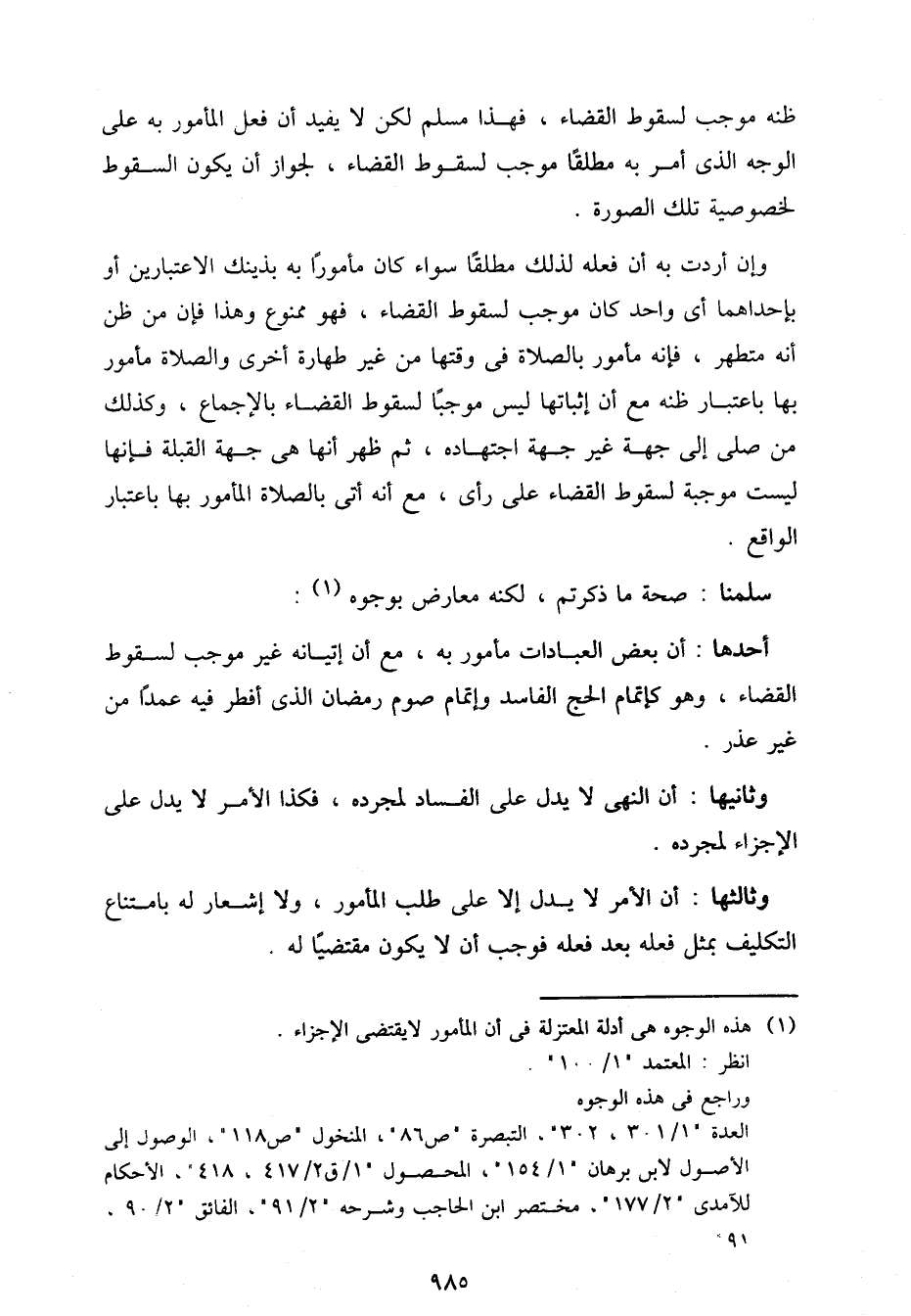 وإن أردت به أن فعله لذلك مطلقًا سواء كان مأمورًا به بذينك الاعتبارين أو بإحداهما أي واحد كان موجب لسقوط القضاء، فهو ممنوع وهذا فإن من ظن أنه متطهر، فإنه مأمور بالصلاة في وقتها من غير طهارة أخرى والصلاة مأمور بها باعتبار ظنه مع أن إثباتها ليس موجبًا لسقوط القضاء بالإجماع، وكذلك من صلى إلى جهة غير جهة اجتهاده، ثم ظهر أنها هي جهة القبلة فإنها ليست موجبة لسقوط القضاء على رأي، مع أنه أتى بالصلاة المأمور بها باعتبار الواقع.