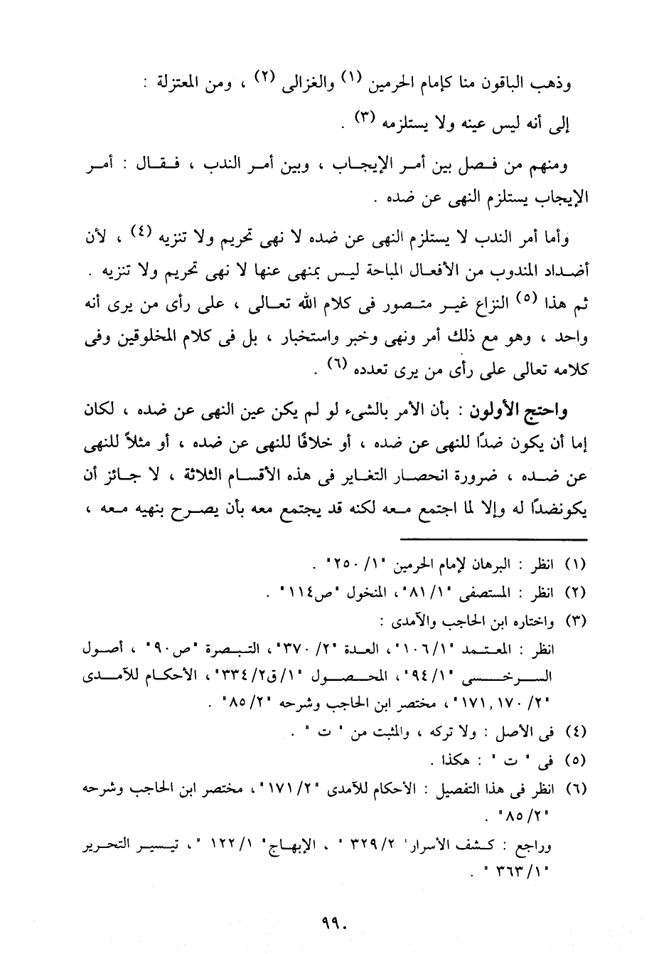 وأما أمر الندب لا يستلزم النهي عن ضده لا نهي تحريم ولا تنزيه، لأن أضداد المندوب من الأفعال المباحة ليس بمنهي عنها لا نهي تحريم ولا تنزيه. ثم هذا النزاع غير متصور في كلام الله تعالى، على رأي من يرى أنه واحد، وهو مع ذلك أمر ونهي وخبر واستخبار، بل في كلام المخلوقين وفي كلامه تعالى على رأي من يرى تعدده.