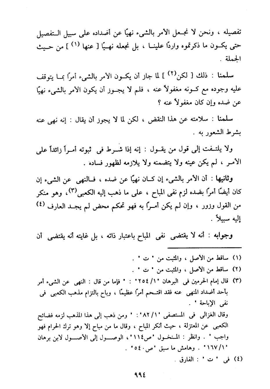 وثانيها: أن الأمر بالشيء إن كان نهيًا عن ضده، فالنهي عن الشيء إن كان أيضًا أمرًا بضده لزم نفي المباح، على ما ذهب إليه الكعبي، وهو منكر من القول وزور، وإن لم يكن أمرًا به فهو تحكم محض لم يجد العارف إليه سبيلاً.