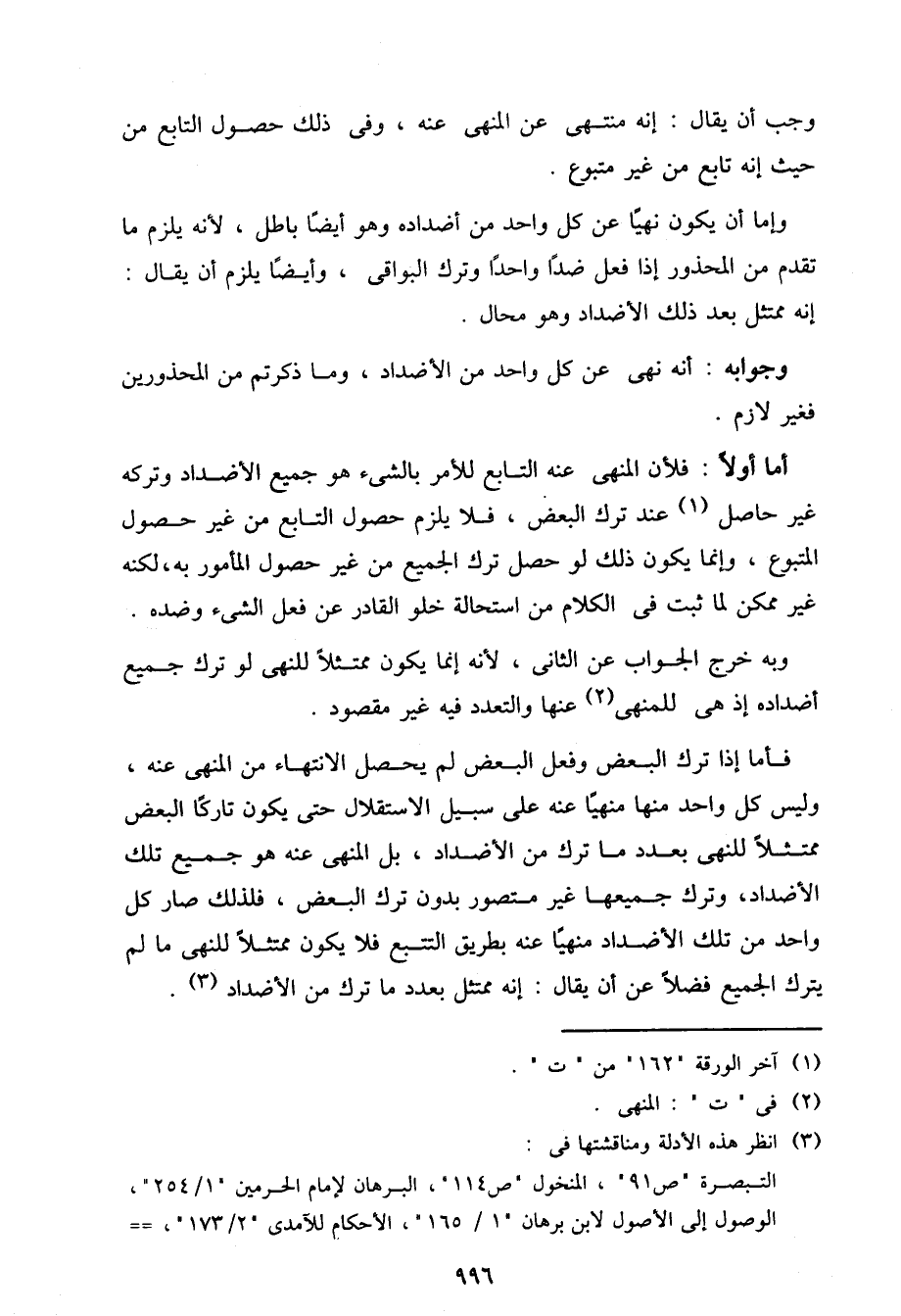 وإما أن يكون نهيًا عن كل واحد من أضداده وهو أيضًا باطل، لأنه يلزم ما تقدم من المحذور إذا فعل ضدًا واحدًا وترك البواقي، وأيضًا يلزم أن يقال: إنه ممتثل بعد ذلك الأضداد وهو محال.