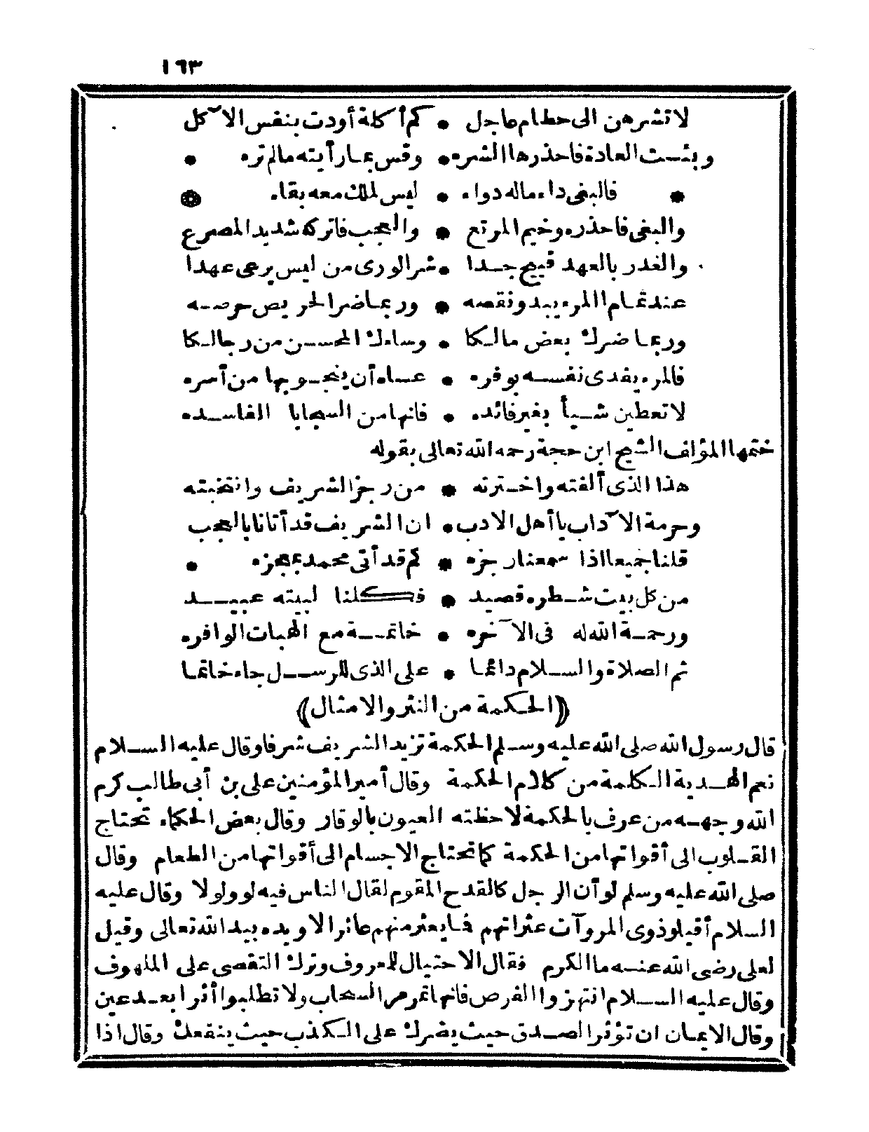 قال رسول الله صلى الله عليه وسلم الحكمة تزيد الشريف شرفاً وقال عليه السلام نعم الهدية الكلمة من كلام بالحكمة، وقال أمير المؤمنين علي بن أبي طالب كرم الله وجهه من عرف بالحكمة لاحظته العيون بالوقار، وقال بعض الحكماء تحتاج القلوب إلى أقواتها من الحكمة كما تحتاج الأجسام إلى أقواتها من الطعام، وقال صلى الله عليه وسلم لو أنّ الرجل كالقدح المقوم لقال الناس فيه لو ولولا وقال عليه الصلاة والسلام أقيموا ذوى المروآت فما يعثر منهم عاثر إلا ويده بيد الله تعالى وقيل لعلى رضي الله عنه ما الكرم فقال الاحتيال للمعروف وترك التقصي على الملهوف وقال عليه السالم انتهزوا الفرص فإنها تمرمر السحاب ولا تطلبوا أثرا بعد عين، وقال الإيمان أن تؤثر الصدق حيث يضرك على الكذب حيث ينفعك وقال إذا