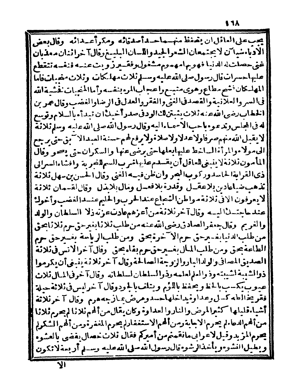 منجيات فأما المهلكات فشح مطاع وهوى متبع وإعجاب المرء بنفسه، وأما المنجيات فخشية الله في السرّ والعلانية والقصد في الغنى والفقر والعدل في الرضا والغضب، وقال عمر بن الخطاب رضي الله عنه: ثلاث يثبتن لك الودّ في صدر أخيك أن تبدأه بالسلام وتوسع له في المجلس وتدعوه بأحب الأسماء إليه، وقال رسول الله صلى الله عليه وسلم (ثلاثة لا يقبل الله منهم صرفاً ولا عدلاًَ ولا صلاة ولا يرفع لهم حسنة: العبد الآبق حتى يرجع إلى مولاه والمرأة الساخط عليها بعلها حتى يرضى عنها والسكران حتى يصحو) وقال المأمون: ثلاثة لا ينبغي للعاقل أن يقدم عليها شرب السم للتجربة وإفشاء السرّ إلى ذي القرابة الحاسد وركوب البحر وإن ظن فيه الغنى، وقال الحسن بن سهل: ثلاثة تذهب ضياعاً دين بلا عقل وقدرة بلا فعل ومال بلا بذل، وقال لقمان: ثلاثة لا يعرفون إلا في ثلاثة مواطن، الشجاع عند الحرب والحليم عند الغضب وأخوك عند حاجتك إليه، وقال آخر: ثلاثة من أعزهم عادت عزته ذلاً السلطان والولد والغريم، وقال جعفر الصادق رضي الله عنه: من طلب ثلاثاً بغير حق حرم ثلاثاً بحق، من طلب الدنيا بعير حق حرم الآخرة بحق، ومن طلب الرياسة بغير حق حرم الطاعة بحق، ومن طلب المال بغير حق حرم بقاءه بحق، وقال آخر: الأنس في ثلاثة، الصديق المصافي والولد البارّ والزوجة الصالحة، وقال آخر: ثلاثة ينبغي أن يُكرموا ذو الشيبة لشيبته وذو العلم لعلمه وذو السلطان لسلطانه، وقال آخر: في المال ثلاثة عيوب يكسب بالحظ ويحفظ باللؤم ويتلف بالجود، وقال آخر: ليس في ثلاثة حيلة فقر يخالطه كسل، وعداوة يداخلها حسد، ومرض يمازجه هرم، وقال آخر: ثلاثة أشياء قليلها كثير المرض والنار والعداوة، وكان يقال من ألهم ثلاثاً لم يحرم ثلاثاً، من ألهم الدعاء لم يحرم الإجابة، ومن ألهم الاستغفار لم يحرم المغفرة، ومن ألهم الشكر لم يحرم المزيد، وقيل لأعرابي ما نقمتم من أميركم فقال ثلاث خصال: يقضي بالعشوة ويطيل النشوة ويأخذ الرشوة. قال رسول الله صلى الله عليه وسلم (أربعة لا تكون