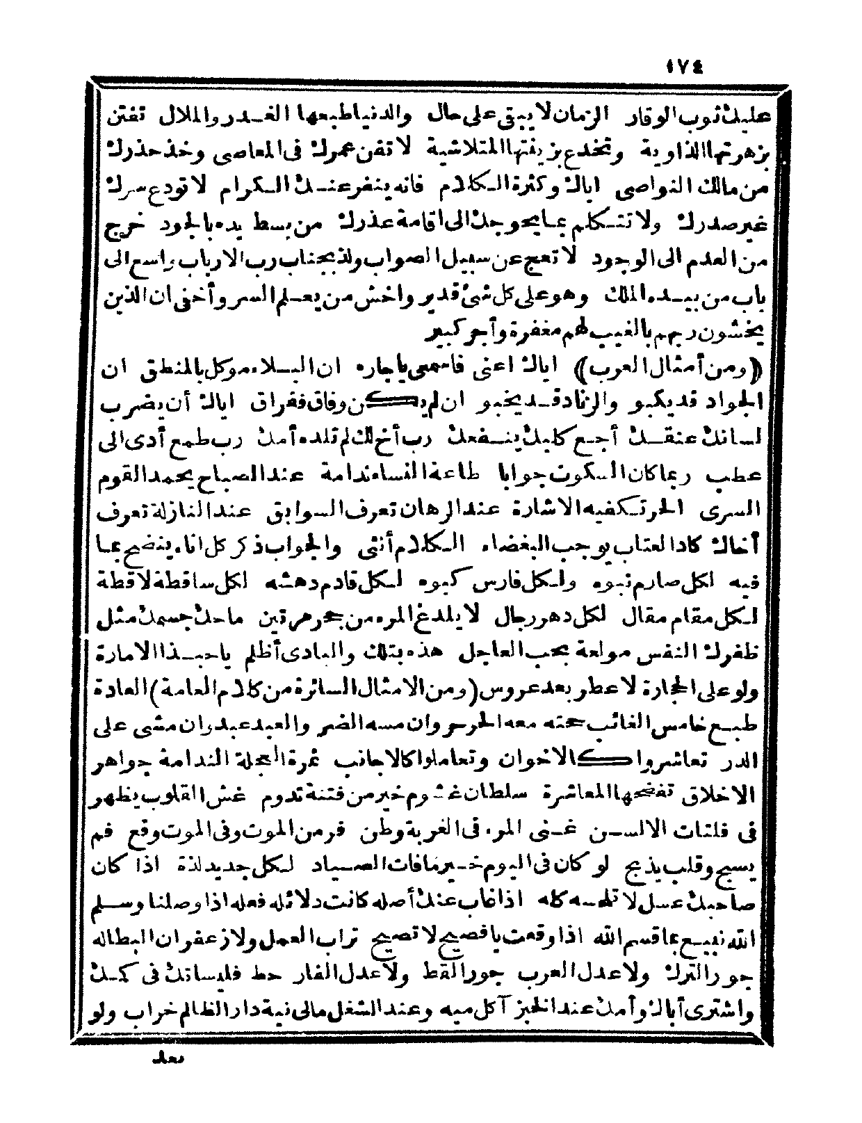 عليك ثوب الوقار، الزمان لا يبقى على حال والدنيا طبعها الغدر والملال تفتن بزهرتها الداوية وتخدع بزينتها المتلاشية، لا تفن عمرك في المعاصي وخذ حذرك من مالك النواصي، إياك وكثرة الكلام فإنه ينفر عنك الكرام، لا تودع سرك غير صدرك ولا تتكلم بما يحوجك إلى إقامة عذرك، من بسط يده بالجود خرج من العدم إلى الوجود، لا تعج عن سبيل الصواب ولذ بجناب ربّ الأرباب واسع إلى باب من بيده الملك وهو على كل شيء قدير، واخش من يعلم السر واخفى - إن الذين يخشون ربهم بالغيب لهم مغفرة وأجر كبير -.