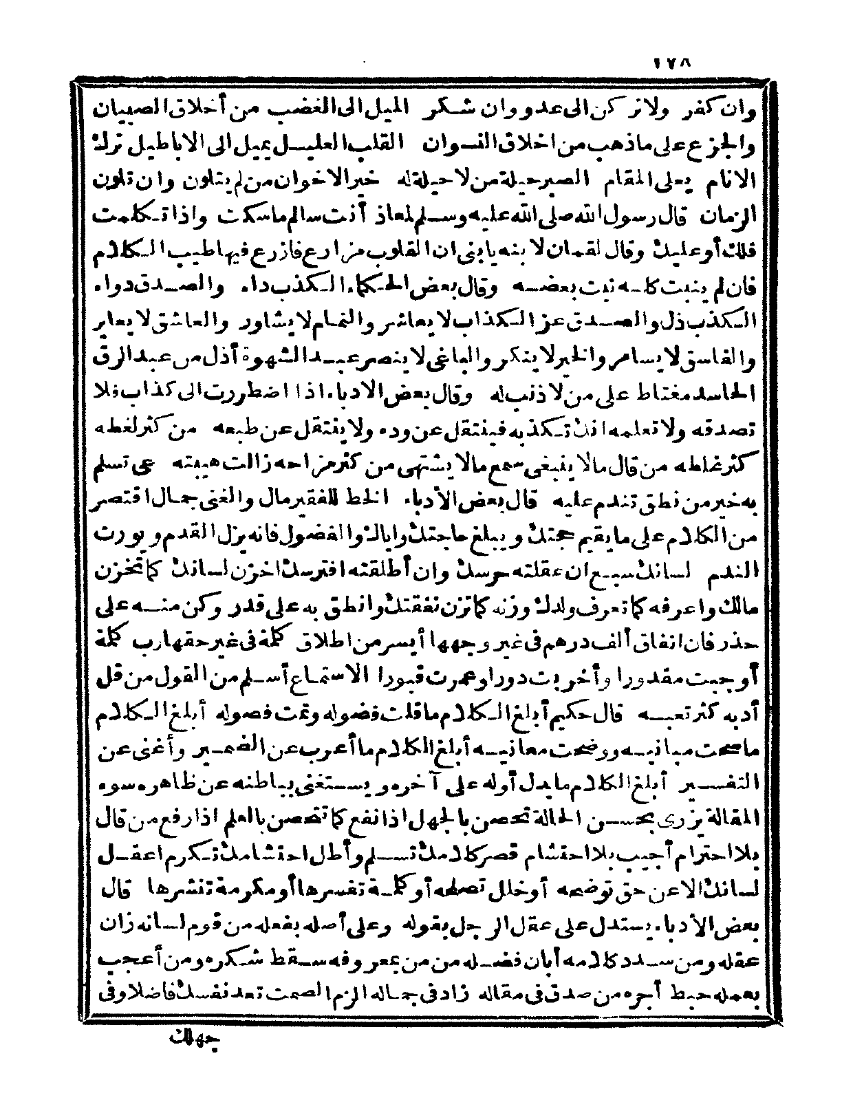 وإن كفر ولا تركن إلى عدوّ وإن شكر، الميل إلى الغضب من أخلاق الصبيان، والجزع على ما ذهب من أخلاق النسوان، القلب العليل يميل إلى الأباطيل، ترك الأنام يعلي المقام، الصبر حيلة من لا حيلة له، خير الأخوان من لم يتلون وإن تلون الزمان، قال رسول الله صلى الله عليه وسلم لمعاذ (أنت سالم ما سكت وإذا تكلمت فلك أو عليك)، وقال لقمان لابنه يا بني إن القلوب مزارع فازرع فيها طيب الكلام فإن لم ينبت كله نبت بعضه، وقال بعض الحكماء الكذب داء والصدق دواء، الكذب ذل والصدق عز، الكذاب لا يعاشر والنمام لا يشاور والعاشق لا يُعاير والفاسق لا يسامر والخير لا ينكر والباغي لا ينصر، عبد الشهوة أذل من عبد الرق، الحاسد مغتاظ على من لا ذنب له، وقال بعض الأدباء إذا اضطررت إلى كذاب فلا تصدقه ولا تعلمه أنك تكذبه فينتقل عن وده ولا