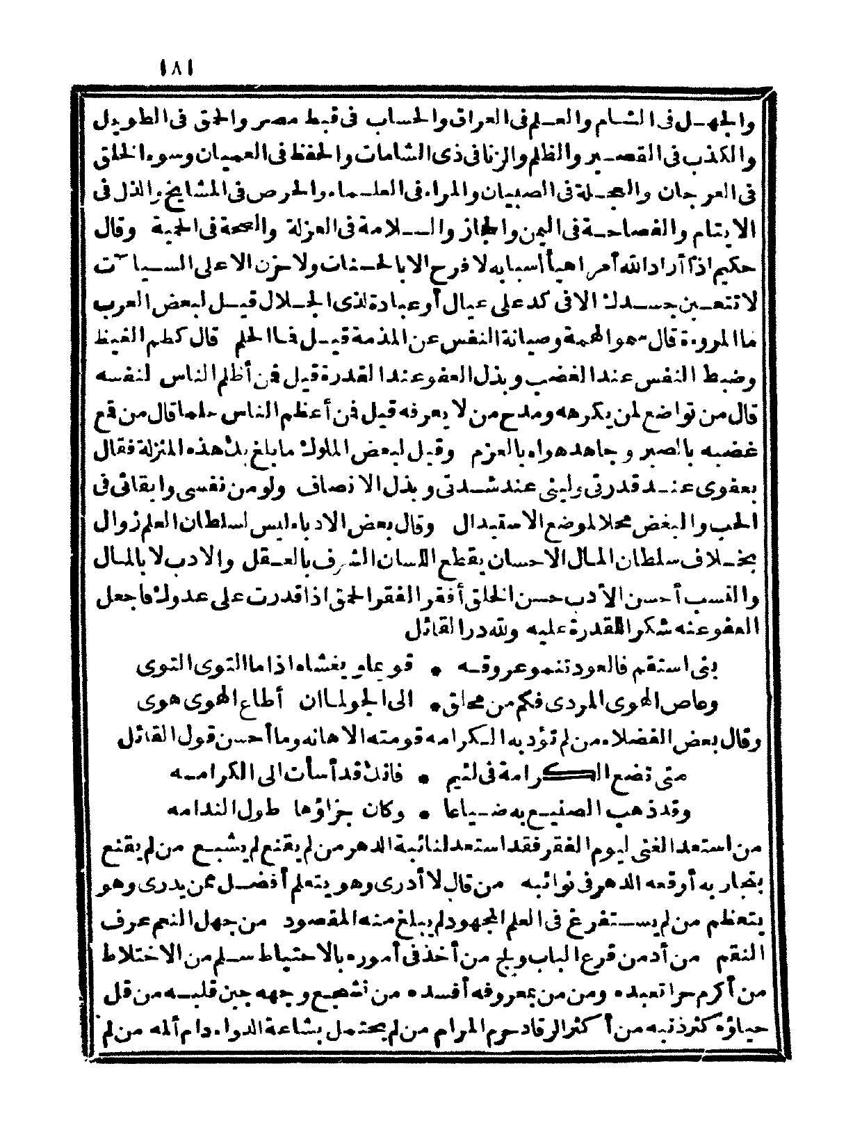 المنزلة، فقال بعفوي عند قدرتي وليني عند شدتي وبذل الإنصاف ولو من نفسي وإبقائي في الحب والبغض محلا لموضع الاستبدال، وقال بعض الأدباء ليس لسلطان العلم زوال بخلاف سلطان المال، الإحسان يقطع اللسان، الشرف بالعقل والأدب لا بالمال والنسب، أحسن الأدب حسن الخلق، أفقر الفقر الحمق، إذا قدرت على عدوّك فاجعل العفو عنه شكراً للقدرة عليه، ولله در القائل: