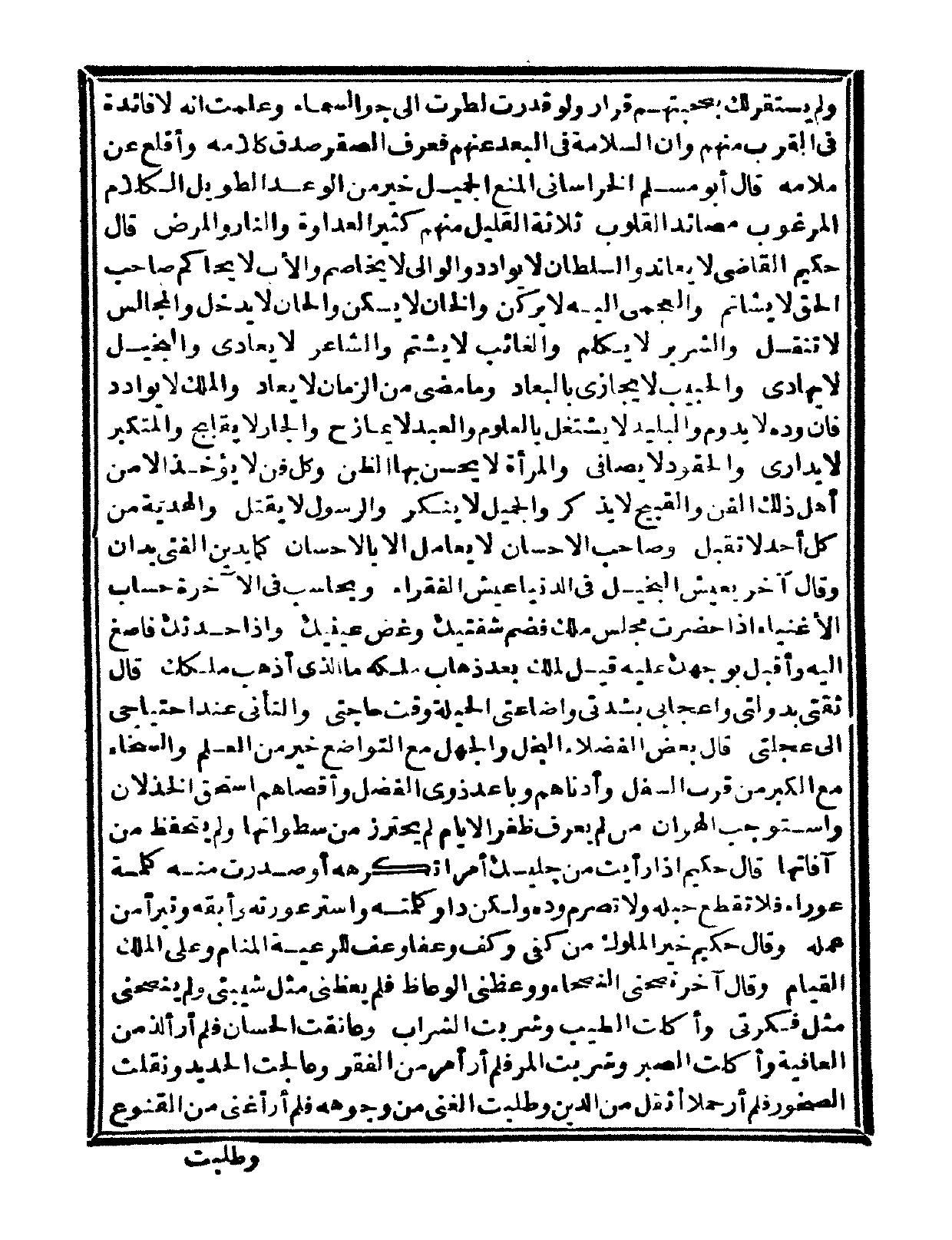 قال أبو مسلم الخراساني المنع الجميل خير من الوعد الطويل، الكلام المرغوب مصائد القلوب، ثلاثة القليل منهم كثير العداوة والنار والمرض، قال حكيم القاضي لا يعاند والسلطان لا يُوادد والوالي لا يخاصم والأب لا يُحاكم وصاحب الحق لا يُشاتم والعجمي إليه لا يركن والخان لا يسكن والحان لا يدخل والمجالس لا تنقل والشرير لا يكلم والغائب لا يشتم والشاعر لا يعادى والبخيل لا يهادى والحبيب لا يجازى بالبعاد وما مضى من الزمان لا يعاد والملك لا يوادد فإن وده لا يدوم والبليد لا يشتغل بالعلوم والعبد لا يمازح والجار لا يقابح والمتكبر لا يدارى والحقود لا يصافى والمرأة لا يحسن بها الظن وكل فن لا يؤخذ إلا من أهل ذلك الفن والقبيح لا يذكر والجميل لا ينكر والرسول لا يقتل والهدية
