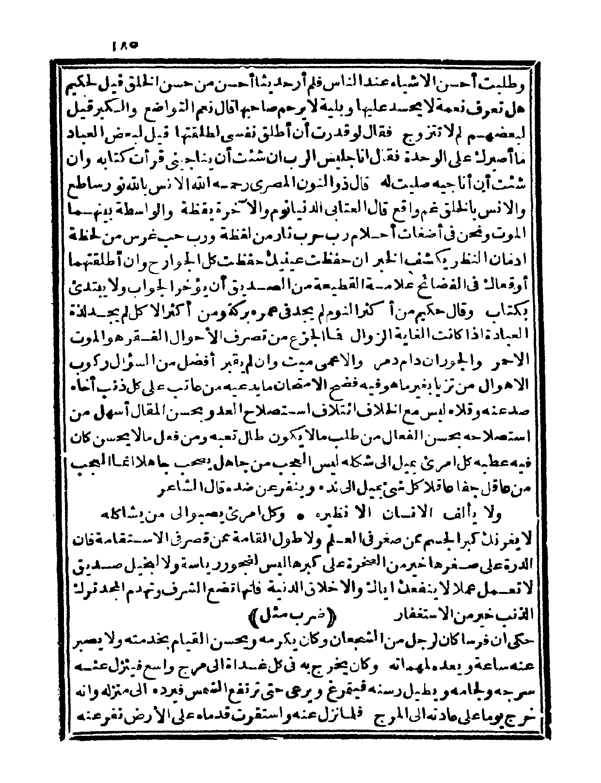 وطلبت أحسن الأشياء عند الناس فلم أر حديثاً أحسن من حسن الخلق، قيل لحكيم هل تعرف نعمة لا يحسد عليها وبلية لا يرحم صاحبها قال نعم التواضع والكبر، قيل لبعضهم لم لا تتزوج؟ فقال لو قدرت أن أطلق نفسي لطلقتها، قيل لبعض العباد ما أصبرك على الوحدة؟ فقال أنا جليس الرب إن شئت أن يناجيني قرأت كتابه وإن شئت أن اناجيه صليت له، قال ذو النون المصري رحمه الله الأنس بالله نور ساطع والأنس بالخلق غم واقع، قال العتابي: الدنيا نوم والآخرة يقظة والواسطة بينهما الموت ونحن في أضغاث أحلام، رب حرب ثار من لفظة ورب حب غرس من لحظة، إدمان الناظر يكشف الخبر، إن حفظت عينيك حفظت كل الجوارح، وإن أطلقتهما أوقعاك في الفضائح، علامة القطيعة من الصديق أن يؤخر الجواب ولا يبتدئ بكتاب، وقال حكيم من أكثر النوم لم يجد في عمره بركة ومن أكثر الأكل لم يجد لذة العبادة، إذا كانت الغاية الزوال فما الجزع من تصرف الأحوال، الفقر هو الموت الأحمر