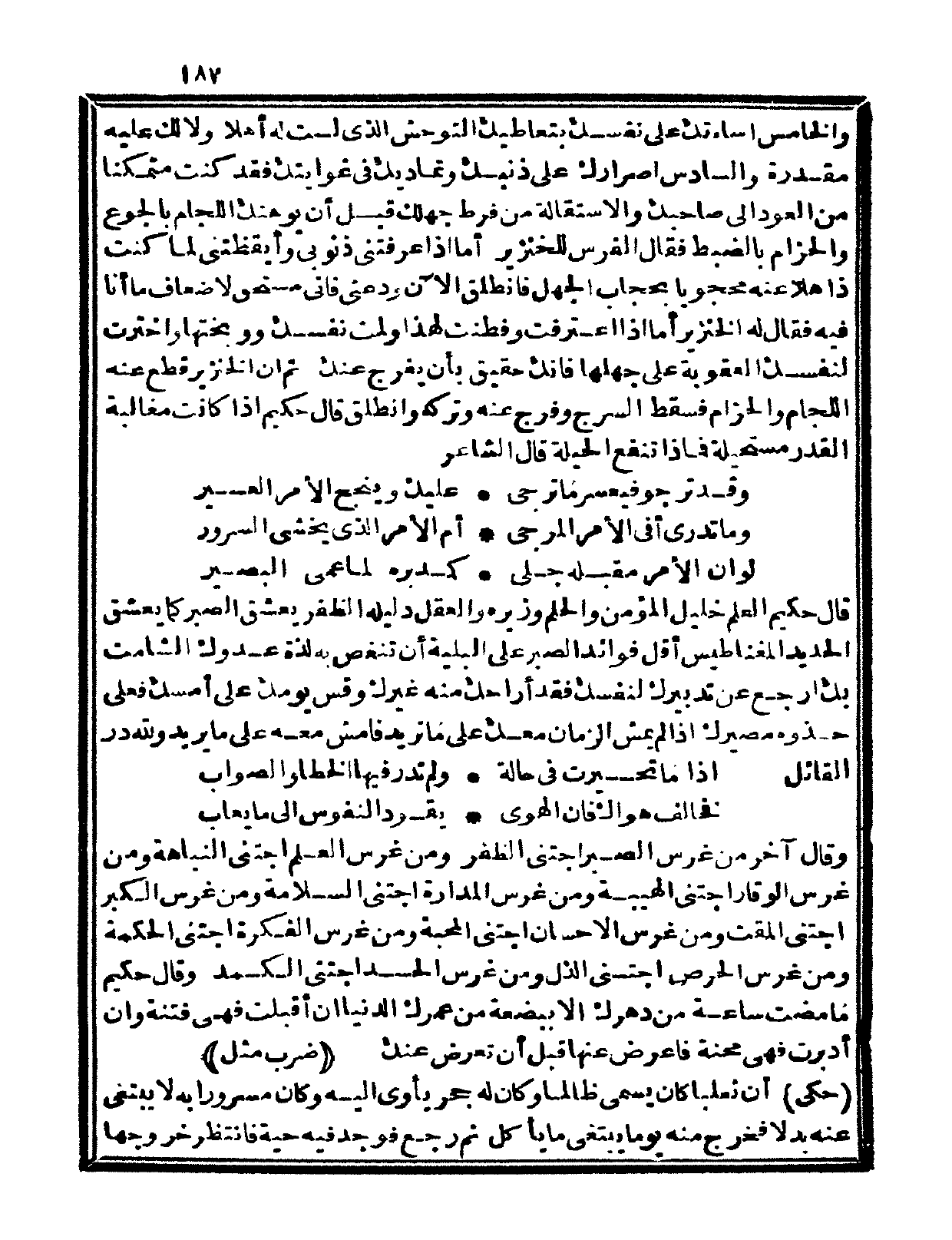 قال حكيم: العلم خليل المؤمن والحلم وزيره والعقل دليله الظفر يعشق الصبر كما يعشق الحديد المغناطيس، أقل فوائد الصبر على البلية أن تنغص به لذة عدوك الشامت بك، ارجع عن تدبيرك لنفسك فقد أراحك منه غيرك وقس يومك على أمسك فعلى حذوه مصيرك، إذا لم يمش الزمان معك على ما تريد فامش معه على ما يريد ولله در القائل: