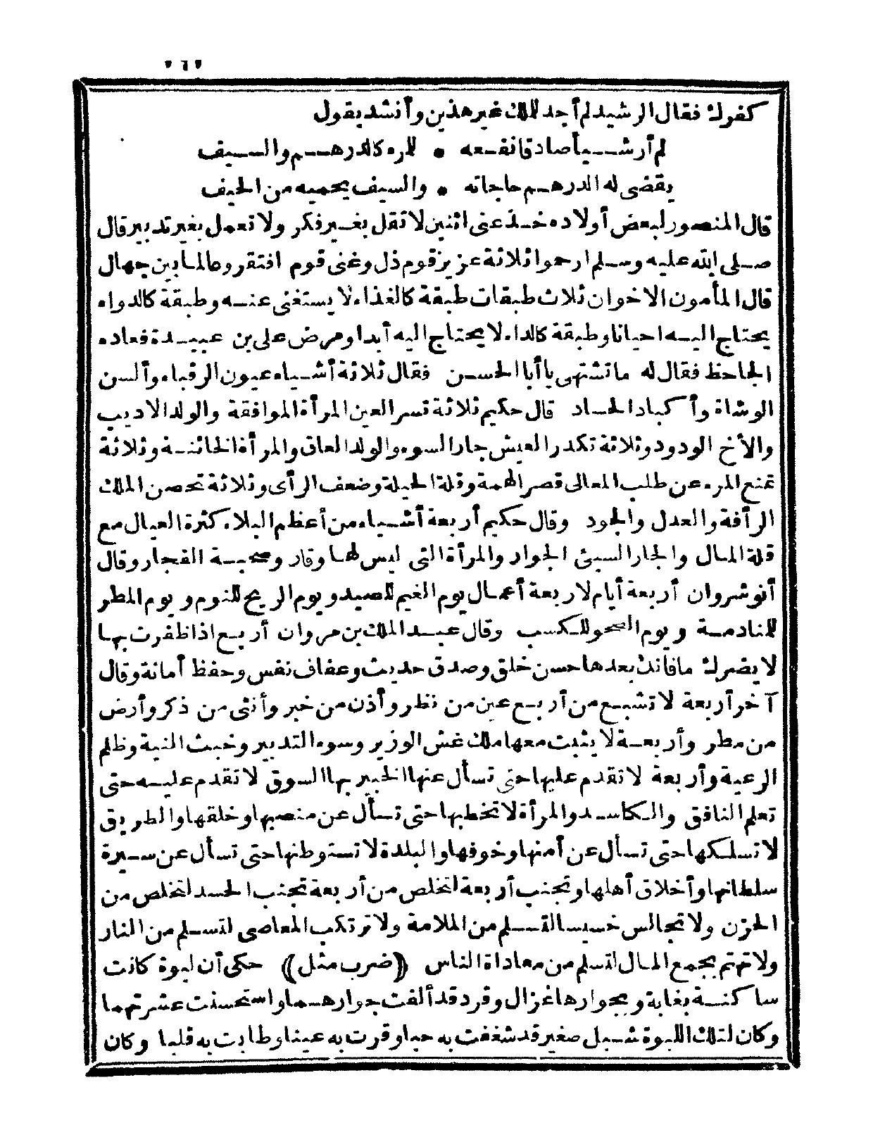 العيش جار السوء والولد العاق والمرأة الخائنة، وثلاثة تمنع المرء عن طلب المعالي قصر الهمة وقلة الحيلة وضعف الرأي، وثلاثة تحصن الملك الرأفة والعدل والجود، وقال حكيم أربعة أشياء من أعظم البلاء كثرة العيال مع قلة المال، والجار السيئ الجوار، والمرأة التي ليس لها وقار، وصحبة الفجار، وقال أنوشروان أربعة أيام لأربعة أعمال يوم الغيم للصيد ويوم الريح للنوم ويوم المطر للمنادمة ويوم الصحو للكسب، وقال عبد الملك بن مروان أربع إذا ظفرت بها لا يضرك ما فاتك بعدها: حسن خلق وصدق حديث وعفاف نفس وحفظ أمانة، وقال آخر أربعة لا تشبع من أربع عين من نظر وأذن من خبر وأنثى من ذكر وأرض من مطر، وأربعة لا يثبت معها ملك غش الوزير وسوء التدبير وخبث النية وظلم الرعية، وأربعة لا تقدم عليها حتى تسأل الخبير بها، السوق لا تقدم عليه حتى تعلم النافق والكاسد والمرأة لا تخطبها حتى تسأل عن منصبها وخلقها والطريق لا تسلكها حتى تسأل عن أمنها وخوفها والبلدة لا تستوطنها حتى تسأل عن سيرة سلطانها وأخلاق أهلها وتجنب أربعة لتخلص من أربعة تجنب الحسد لتخلص من الحزن ولا تجالس خسيساً لتسلم من الملامة ولا ترتكب المعاصي لتسلم من النار ولا تهتم بجمع المال لتسلم من معاداة الناس.