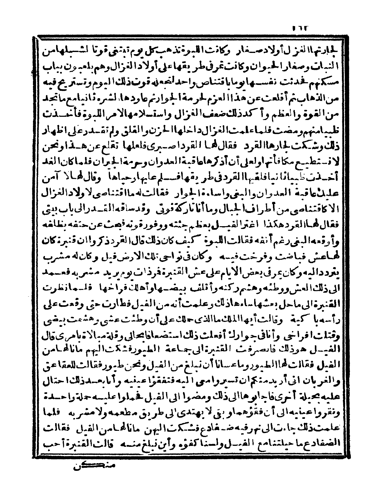 عليك عاقبة العدوان والبغي وإساءة الجوار فقالت له ما اقتناصي لأولاد الغزال إلا كاقتناصي من أطراف الجبال وما أنا تاركة قوتي وقد ساقه القدر إلى باب بيتي، فقال لها القرد هكذا اغتر الفيل بعظم جثته ووفور قوته فبحث عن حتفه بظلفه وأوقعه البغي رغم أنفه، فقالت اللبوة كيف كان ذلك. قال القرد ذكروا أن قنبرة كان لها عش فباضت وفرخت فيه وكان في نواحي تلك الأرض فيل وكان له مشرب يتردد إليه وكان يمر في بعض الأيام على عش القنبرة فمر ذات يوم يريد مشربه فعمد إلى ذلك العش ووطئه وهشم ركنه وأتلف بيضها وأهلك فراخها، فلما نظرت القنبرة إلى ما حل بعشها ساءها ذلك وعلمت أنه من الفيل فطارت حتى وقعت على رأسه باكية وقالت أيها الملك ما الذي حملك على أن وطئت عشي وهشمت بيضي وقتلت أفراخي وأنا في جوارك أفعلت ذلك استضعافاً بحالي وقلة مبالاة بأمري؟ قال الفيل هو ذلك فانصرفت القنبرة إلى جماعة من الطيور فشكت إليهم ما نالها من الفيل فقالت لها الطيور وما عسانا أن نبلغ من الفيل ونحن طيور فقالت للعقاعق والغربان إني أريد منكم أن تسيروا معي إليه فتفقئوا عينيه وأنا بعد ذلك أحتال عليه بحيلة أخرى فأجابوها إلى ذلك ومضوا إلى الفيل فحملوا عليه حملة واحدة ونقروا عينيه إلى أن فقئوهما وبقي لا يهتدي إلى طريق مطعمه ولا مشربه فلما علمت ذلك جاءت إلى نهر فيه ضفادع فشكت إليهن ما نالها من الفيل فقالت الضفادع ما حيلتنا مع الفيل ولسنا كفؤه وأين نبلغ منه؟ قالت القنبرة أحب