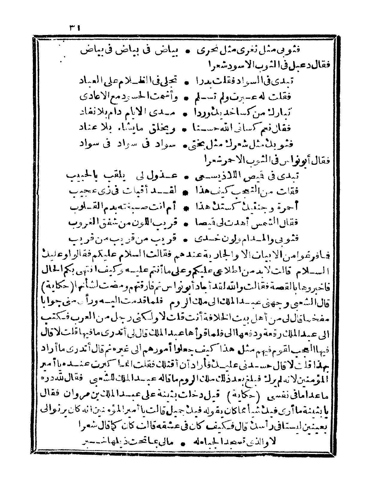 حكاية: قال الشعبي وجهني عبد الملك إلى ملك الروم، فلما قدمت إليه ورأى مني جواباً مفحماً. قال لي من أهل بيت الخلافة أنت؟ قلت لا ولكني رجل من العرب فكتب إلى عبد الملك رقعة ودفعها إليّ، فلما قرأها عبد الملك قال أتدري ما فيها قلت لا، قال: فيها العجب لقوم فيهم مثل هذا كيف جعلوا أمورهم إلى عيره ثم قال أتدري ما أراد بهذا؟ قلت لا قال حسدني عليك فأراد أن أقتلك، فقلت إنما كبرت عنده يا أمير المؤمنين لأنه لم يرك فبلغ بعد ذلك ملك الروم ما قاله عبد الملك للشعبي، فقال لله دره ما عدا ما في نفسي.