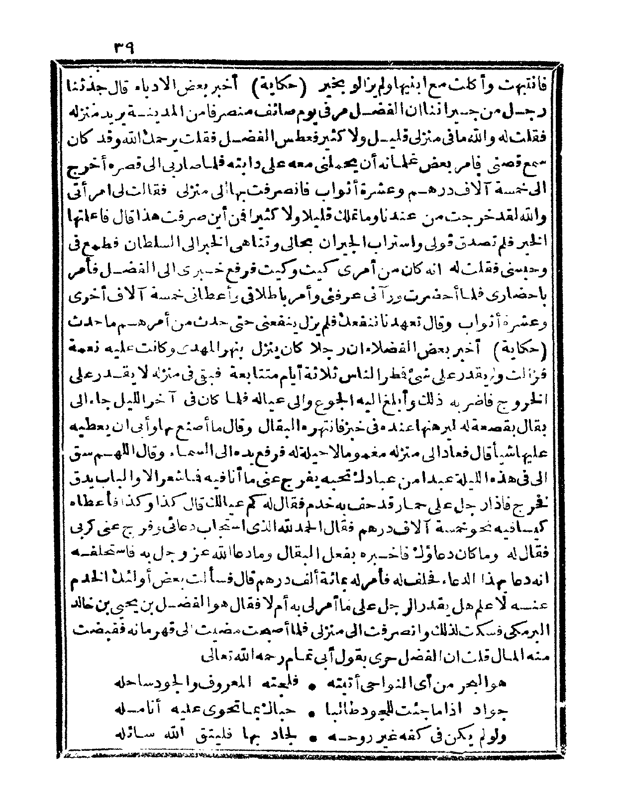 منزلي فقالت لي امرأتي والله لقد خرجت من عندنا وما تملك قليلاً ولا كثيراً فمن أين صرفت هذا؟ قال فأعلمتها الخبر فلم تصدق قولي واستراب الجيران في حالي وتناهى الخبر إلى السلطان فطمع فيّ وحبسني فقلت له إنه كان من أمري كيت وكيت فرفع خبري إلى الفضل فأمر بإحضاري، فلما أحضرت ورآني عرفني وأمر بإطلاقي وأعطاني خمسة آلاف درهم وعشرة أثواب وقال تعهدنا ننفعك فلم يزل ينفعني حتى حدث من أمرهم ما حدث.