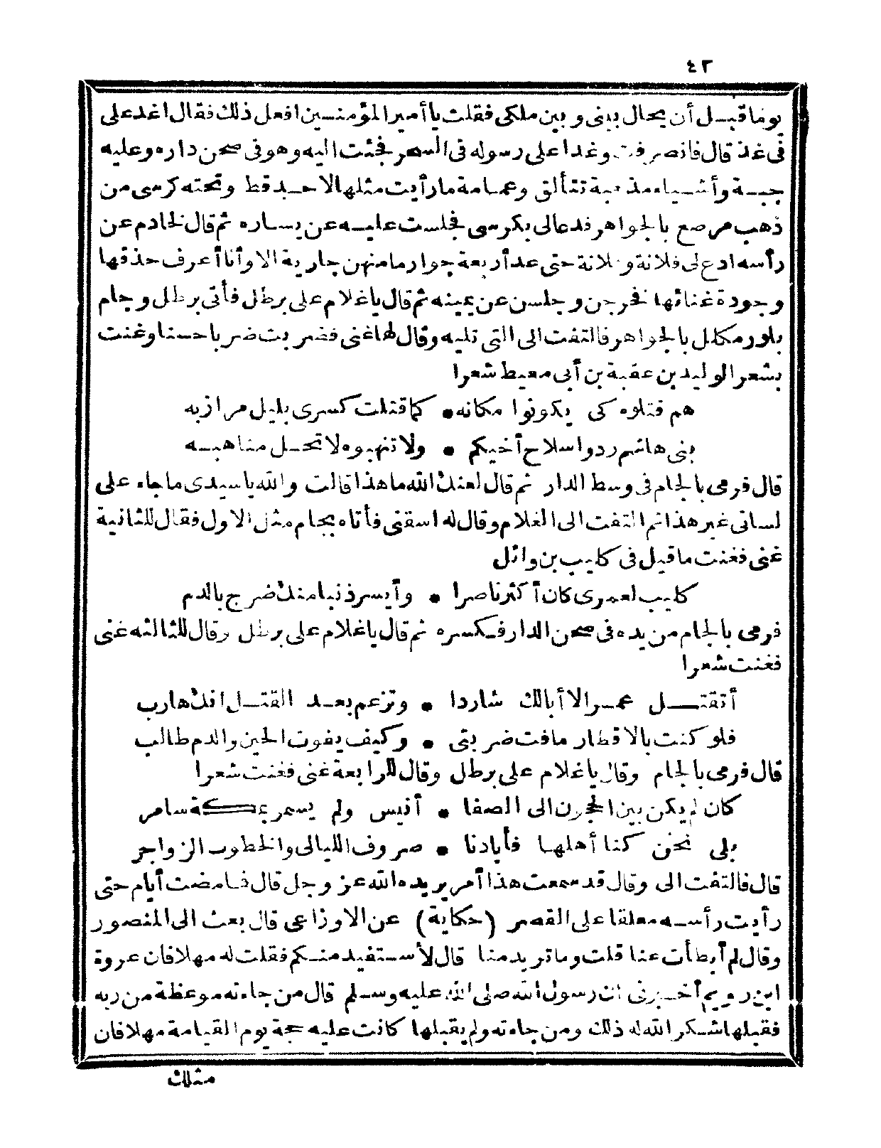 قال فرمى بالجام في وسط الدار، ثم قال لعنك الله ما هذا؟ قالت والله يا سيدي ما جاء على لساني غير هذا، ثم التفت إلى الغلام وقال له اسقني فأتاه بجام مثل الأول فقال للثانية غني فغنت ما قيل في كليب بن وائل: