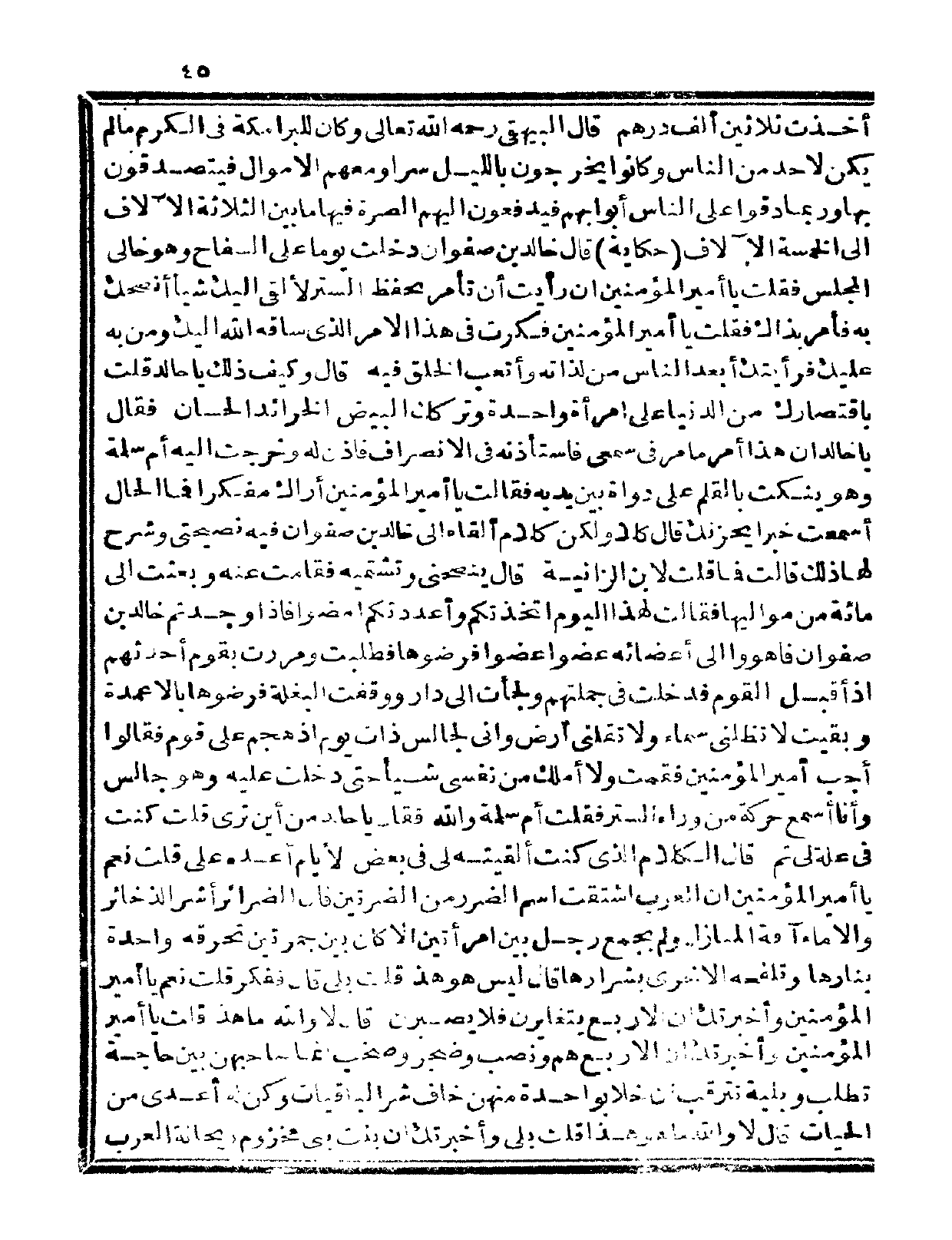 حكاية: قال خالد بن صفوان دخلت يوماً على السفاح وهو خالي المجلس، فقلت يا أمير المؤمنين إن رأيت أن تأمر بحفظ الستر لألقي إليك شيئاً أنصحك به فأمر بذاك فقلت يا أمير المؤمنين فكرت في هذا الأمر الذي ساقه الله إليك ومن به عليك فرأيتك أبعد الناس من لذاته وأتعب الخلق فيه، قال وكيف ذلك يا خالد قلت باقتصارك من الدنيا على امرأة واحدة وتركك البيض الخرائد الحسان، فقال يا خالد إن هذا أمر ما مر في سمعي فاستأذنه في الانصراف فأذن له وخرجت إليه أم سلمة وهو ينكت بالقلم على دواة بين يديه، فقالت يا أمير المؤمنين أراك مفكراً فما الحال أسمغت خبراً يحزنك؟ قال كلا ولكن كلام ألقاه إليّ خالد بن صفوان فيه نصيحتي وشرح لها ذلك. قالت فما قلت لابن الزانية؟ قال ينصحني وتشمتينه، فقامت عنه وبعثت إلى مائة من مواليها فقالت لهذا اليوم اتخذتكم وأعددتكم امضوا فإذا وجدتم خالد بن صفوان فاهووا إلى أعضائه عضواً عضواً فرضوها فطلبت ومررت بقوم أحدثهم إذ أقبل القوم فدخلت في جملتهم ولجأت إلى دار ووقعت البغلة فرضوها بالأعمدة وبقيت لا تظلني سماء ولا تقلني أرض وإني لجالس ذات يوم إذ هجم عليّ قوم، فقالوا أجب أمير المؤمنين فقمت ولا أملك من نفسي شيئاً حتى دخلت عليه وهو جالس وأنا أسمع حركة من وراء الستر فقلت أم سلمة والله؟ فقال يا خالد من أين ترى قلت كنت في علة لي، ثم قال الكلام الذي كنت ألقيته لي في بعض الأيام أعده عليّ قلت نعم يا أمير المؤمنين إن العرب اشتقت اسم الضرر من الضرتين فإن الضرائر أشد الذخائر والإماء آفة المنازل ولم يجمع رجل بين امرأتين إلا كان بين جمرتين تحرقه واحدة بنارها وتلحقه الأخرى بشرارها قال ليس هو هذا قلت بلى قال ففكر قلت نعم يا أمير المؤمنين وأخبرتك أن الثلاث يتغايرن فلا يصبرن، قال لا والله ما هذا قلت يا أمير المؤمنين وأخبرتك أن الأربع همّ ونصب وضجر وصخب إنما صاحبهن بين حاجة تطلب وبلية تترقب إن خلا بواحدة منهن خاف شر الباقيات وكنا له أعدى من الحيات، قال لا والله ما هو هذا قلت بلى وأخبرتك أن بني مخزوم ريحانة العرب