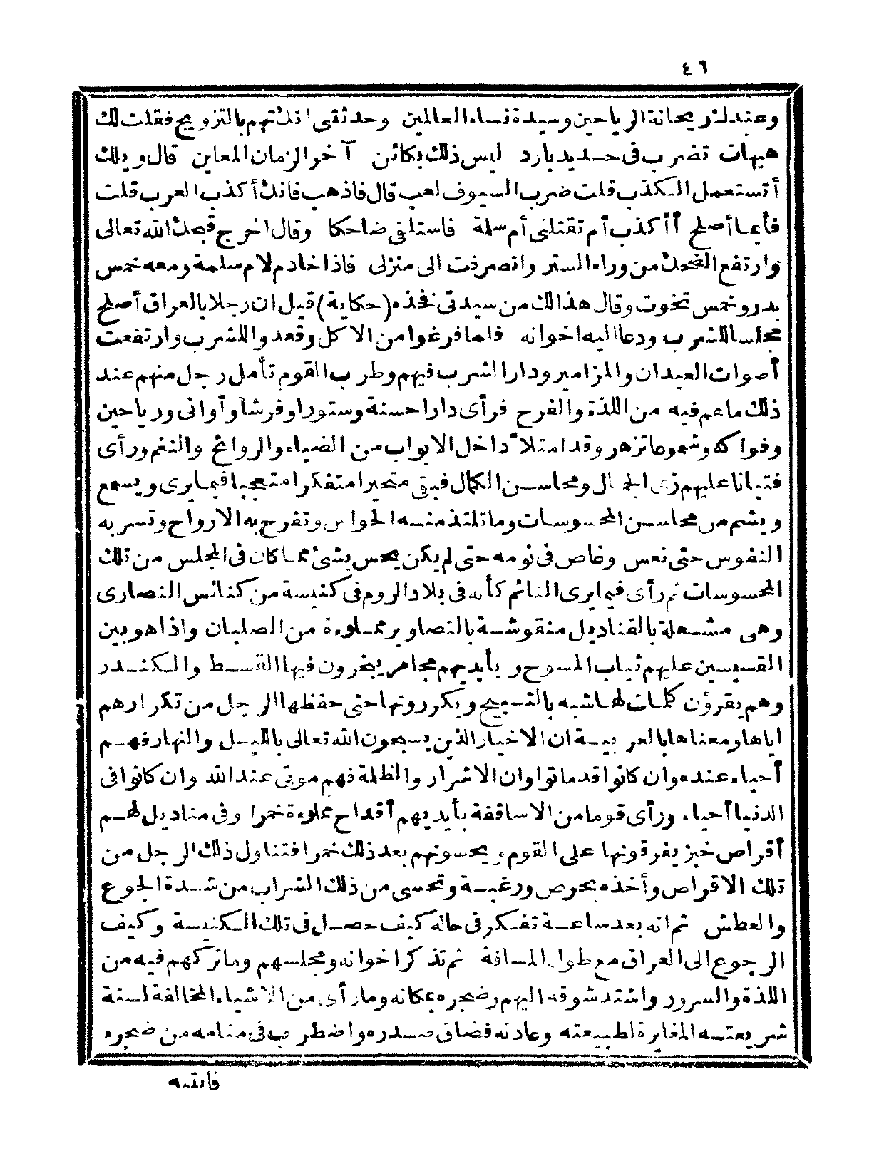 حكاية: قيل إن رجلاً بالعراق أصلح مجلساً للشرب ودعا إليه إخوانه، فلما فرغوا من الأكل وقعدوا للشرب وارتفعت أصوات العيدان والمزامير ودار الشرب فيهم وطرب القوم تأمل رجل منهم عند ذلك ما هم فيه من اللذة والفرح فرأى داراً حسنة وستوراً وفرشاً وأواني ورياحين وفواكه وشموعاً تزهر وقد امتلأ داخل الأبواب من الضياء والروائح والنغم ورأى فتياناً عليهم زي الجمال ومحاسن الكمال فبقي متحيراً متفكراً متعجباً فيما يرى ويسمع ويشم من محاسن المحسوسات وما تلتذ منه الحواس وتفرح به الأرواح وتسر به النفوس حتى نعس وغاص في نومه حتى لم يكن يحس شيئاً مما كان في المجلس من تلك المحسوسات، ثم رأى فيما يرىة النائم كأنه في بلاد الروم في كنيسة من كنائس النصارى، وهي مشعلة بالقناديل منقوشة بالتصاوير مملوءة من الصلبان، وإذا هو بين القسيسين عليهم ثياب المسوح وبأيديهم مجامر يبخرون فيها القسط والكندر وهم يقرؤون كلمات لها شبه بالتسبيح يكررونها حتى حفظها الرجل من تكرارهم إياها ومعناها بالعربية أن الأخيار الذين يسبحون الله تعالى بالليل والنهار فهم أحياء عنده وإن كانوا قد ماتوا، وإن الأشرار والظلمة فهم موتى عند الله وإن كانوا في الدنيا أحياء، ورأى قوماً من الأساقفة بأيديهم أقداح مملوءة خمراً، وفي مناديل لهم أقراص خبز يفرقونها على الناس ويحسونهم بعد ذلك خمراً فتناول ذلك الرجل من تلك الأقراص، وأخذ بحرص ورغبة وتحسى من ذلك الشراب من شدة الجوع والعطش، ثم إنه بعد ساعة لفكّر في حاله كيف حصل في تلك الكنيسة وكيف الرجوع إلى العراق مع طول المسافة ثم تذكر إخوانه ومجلسهم وما تركهم فيه من اللذة والسرور واشتد شوقه إليهم وضجره بمكانه، وما رأى من الأشياء المخالفة لسنة شريعته المغايرة لطبيعته وعادته فضاق صدره واضطرب في منامه من ضجره