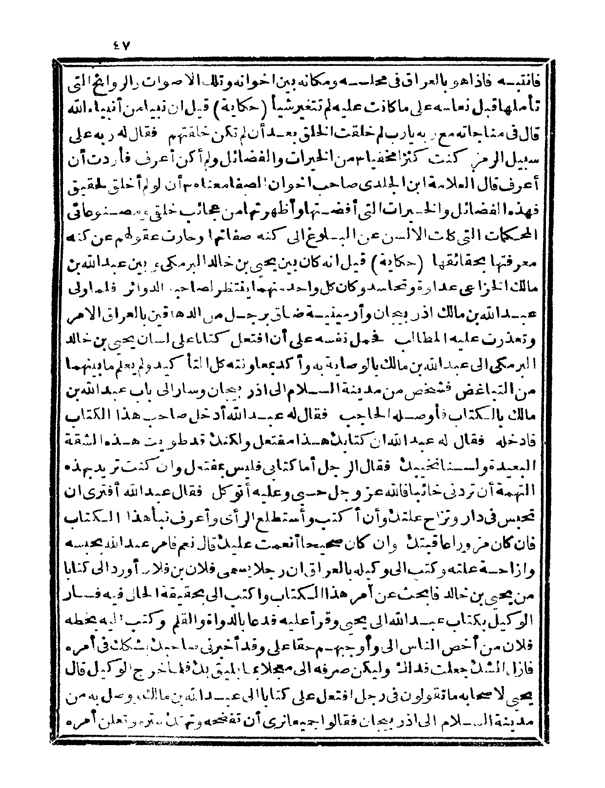 حكاية: قيل إنه كان بين يحيى بن خالد البرمكي، وبين عبد الله بن مالك الخزاعي عداوة وتحاسد، وكان كل واحد منهما ينتظر لصاحبه الدوائر، فلما ولي عبد الله بن مالك أذربيجان وأرمينية ضاق برجل من الدهاقين بالعراق الأمر وتعذرت عليه المطالب فحمل نفسه على أن افتعل كتاباً على لسان يحيى بن خالد البرمكي إلى عبد الله بن مالك بالوصاية به وأكد بمعاونته كل التأكيد ولم يعلم ما بينهما من التباعد فشخص من مدينة السلام إلى أذربيجان وصار إلى باب عبد الله بن مالك بالكتاب فأوصله الحاجب فقال له عبد الله أدخل صاحب هذا الكتاب فأدخله فقال له عبد الله إن كتابك هذا مفتعل ولكنك قد طويت هذه الشقة البعيدة ولسنا نخيبك، فقال الرجل أما كتابي فليس بمفتعل وإن كنت تريد بهذه التهمة أن تردني خائباً فالله عزّ وجلّ حسبي وعليه أتوكل فقال عبد الله أفترى أن تحبس في دار وتزاح علتك وأن أكتب وأستطلع الرأي وأعرف نبأ هذا الكتاب فإن كان مزوراً عاقبتك وإن كان صحيحاً أنعمت عليك قال نعم، فأمر عبد الله بحبسه وإزاحة علته وكتب إلى وكيله بالعراق أن رجلاً يسمى فلان بن فلان أورد إليّ كتاباً من يحيى بن خالد فابحث عن أمر هذا الكتاب واكتب إليّ بالحال فيه فصار الوكيل بكتاب عبد الله إلى يحيى وقرأ عليه فدعا بالدواة والقلم وكتب إليه بخطه فلان من أخص الناس إليّ وأوجبهم حقاً عليّ وقد أخبرني صاحبك بشكك في أمره فأزل الشك جعلت فداك وليكن صرفه إليّ معجلاً بما يليق بك، فلما خرج الوكيل قال يحيى لأصحابه ما تقولون في رجل افتعل عليّ كتاباً إلى عبد الله بن مالك ووصل به من مدينة السلام إلى أذربيجان؟ فقالوا جميعاً نرى أن تفضحه وتهتك ستره وتعلن أمره