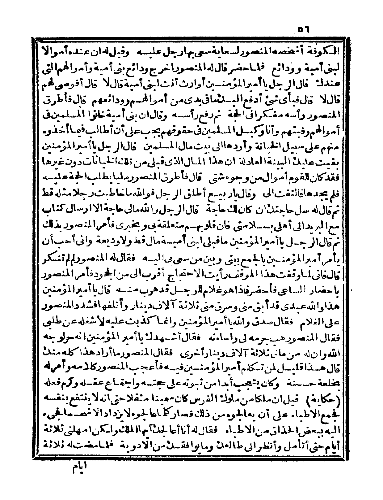 الكوفة أشخصه المنصور لسعاية سعى بها رجل عليه، وقيل له إن عنده أموالاً لبني أمية وودائع، فلما حضر قال له المنصور أخرج ودائع بني أمية وأموالهم التي عندك. قال الرجل يا أمير المؤمنين أوارث أنت لبني أمية؟ قال: لا. قال أفوصيّ لهم؟ قال لا. قال فبأي شيء أدفع إليك ما في يدي من أموالهم وودائعهم؟ قال فأطرق المنصور رأسه مفكراً في الحجة، ثم رفع رأسه وقال إن بني أمية خانوا المسلمين في أموالهم وأنا وكيل المسلمين في حقوقهم يجب عليّ أن أطالب فيما أخذوه منهم على سبيل الخيانة وأردها إلى بيت مال المسلمين. قال الرجل يا أمير المؤمنين بقيت عليك البينة العادلة أن هذا المال الذي قبلي من تلك الخيانات دون غيرها لقد كان للقوم أموال من وجوه شتى. قال فأطرق المنصور ملياً يطلب الحجة عليه فلم يجدها فالتفت إليّ، وقال يا ربيع أطلق الرجل فوالله ما خاطبت رجلاً مثله قط، ثم قال له سل حاجتك إن كان لك حاجة، قال الرجل والله مالي حاجة إلا إرسال كتاب في البريد إلى أهلي بسلامتي فإن قلوبهم متعلقة بي وبخبري فأمر المنصور بذلك، فقال الرجل يا أمير المؤمنين ما قبلي لني أمية مال قط ولا وديعة وإني أحب أن يأمر أمير المؤمنين بالجمع بيني وبين من سعى بي إليه، فقال له المنصور لم لم تنكر؟ قال فإني لما وقفت هذا الموقف رأيت الاحتجاج أقرب إليّ من الجحود فأمر المنصور بإحضار الساعي فأحضر فإذا هو غلام الرجل قد هرب منه. قال يا أمير المؤمنين هذا والله عبدي قد أبق مني وسرق مني ثلاثة آلاف دينار وأتلفها فشدد المنصور على الغلام، فقال صدق والله يا أمير المؤمنين وإنما كذبت عليه لأشغله عن طلبي، فقال المنصور هب جرمه إليّ وإساءته، فقال أشهدك يا أمير المؤمنين أنه حرّ لوجه الله وإن له من مالي ثلاثة آلاف دينار أخرى، فقال المنصور ما أراد هذا كله منك، قال هذا قليل لمن تكلم أمير المؤمنين فيه، فأعجب المنصور كلامه وأمر له بخلعة حسنة وكان يتعجب أبداً من ثبوته على حجته واجتماع عقله وكرم فعله.