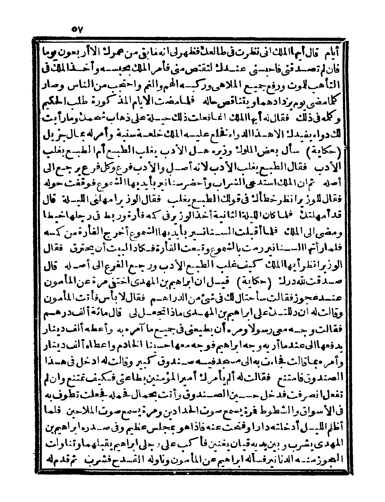 حكاية: سأل بعض الملوك وزيره هل الأدب يغلب الطبع أم الطبع يغلب الأدب؟ فقال الطبع يغلب الأدب لأنه أصل والأدب فرع وكل فرع يرجع إلى أصله، ثم إن الملك استدعى الشراب وأحضر سنانير بأيديهم الشماع فوقفت حوله، فقال للوزير انظر خطأك في قولك الطبلع يغلب؟ فقال الوزير أمهلني الليلة. قال قد أمهلتك، فلما كان الليلة الثانية أخذ الوزير في كمه فأرة وربط في رجلها خيط ومضى إلى الملك، فلما أقبلت السنانير بأيديها الشماع أخرج الفأرة من كمه، فلما رأتها السنانير رمت بالشماع وتبعت الفأرة فكاد البيت أن يحترق، فقال الوزير انظر أيها الملك كيف غلب الطبع الأدب ورجع الفرع إلى أصله؟ قال صدقت لله درك.