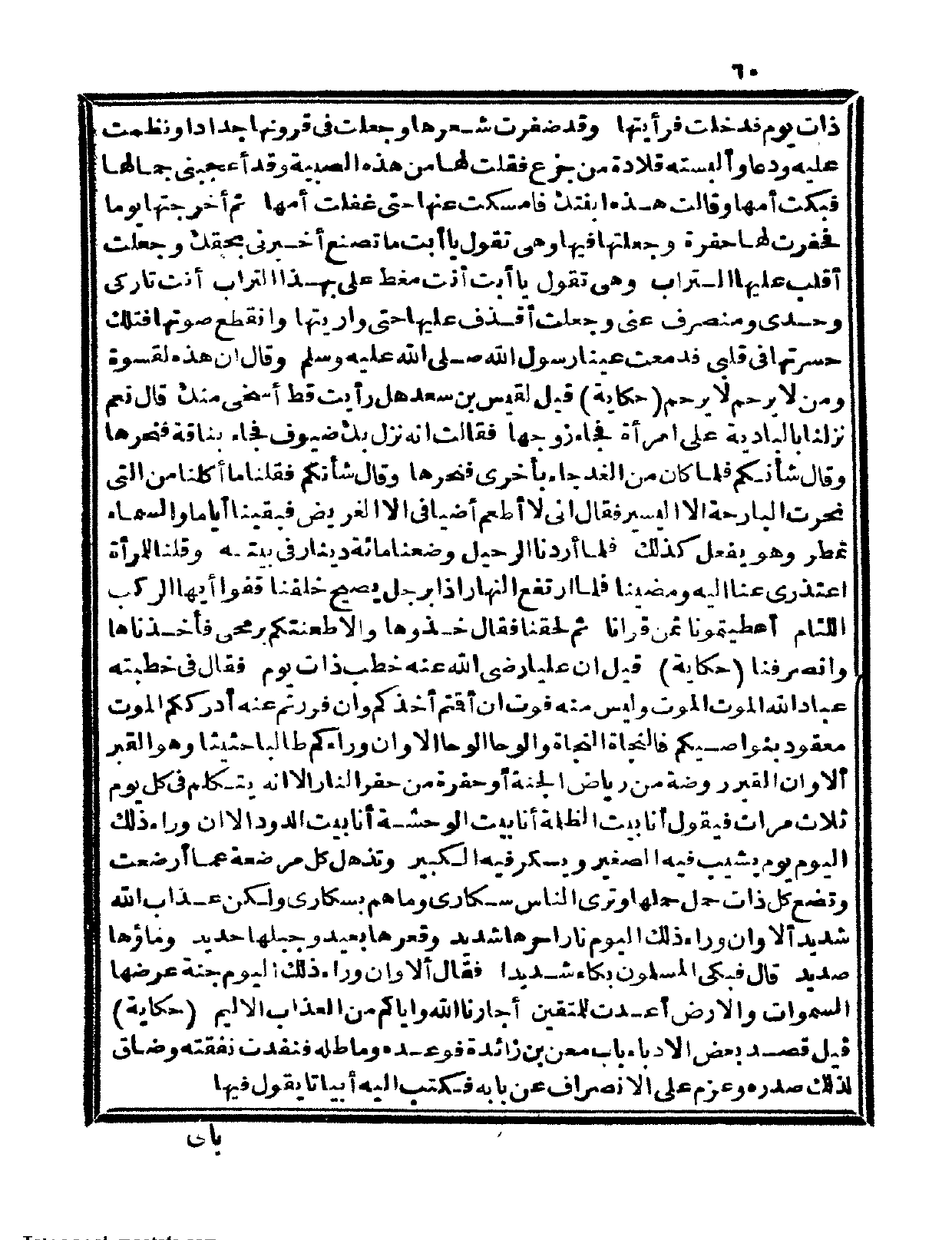 حكاية: قيل إن علياً رضي الله عنه خطب ذات يوم، فقال في خطبته عباد الله الموت الموت وليس منه فوت إن أقمتم أخذكم وإن فررتم عنه أدرككم الموت معقود بنواصيكم فالنجاة النجاة والوحا الوحا، ألا إن وراءكم طالباً حثيثاً، وهو القبر ألا وإن القبر روضة من رياض الجنة أو حفرة من حفر النار إلا أنه يتكلم في كل يوم ثلاث مرات فيقول أنا بيت الظلمة أنا بيت الوحشة أنا بيت الدود إلا أن وراء ذلك اليوم يوم يشيب فيه الصغير ويسكر فيه الكبير - وتذهل كل مرضعة عما أرضعت وتضع كل ذات حمل حملها وترى الناس سكارى وما هم بسكارى ولكن عذاب الله شديد - ألا وإن وراء ذلك اليوم نار حرها شديد وقعرها بعيد وجبلها حديد وماؤها صديد ليس لله فيه رحمة. قال فبكى المسلمون بكاء شديداً، فقال ألا وإن وراء ذلك اليوم - جنة عرضها السماوات والأرض أعدت للمتقين - أجارنا الله وإياكم من العذاب الأليم.