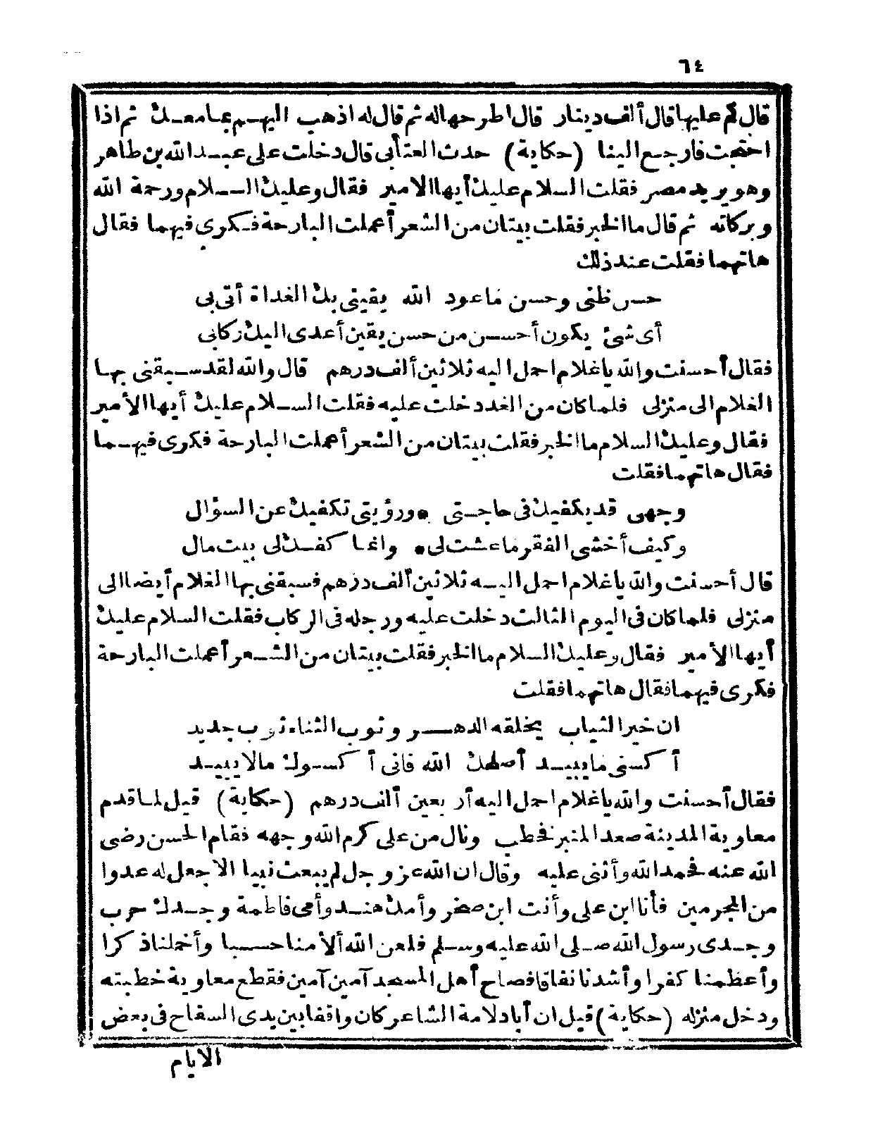 حكاية: حدث العتابي، قال دخلت على عبد الله بن طاهر وهو يريد مصر فقلت السلام عليك أيها المير، فقال وعليك السلام ورحمة الله وبركاته، ثم قال وما الخبر؟ فقلت بيتان من الشعر أعملت البارحة فكري فيهما فقال هاتهما فقلت عند ذلك: