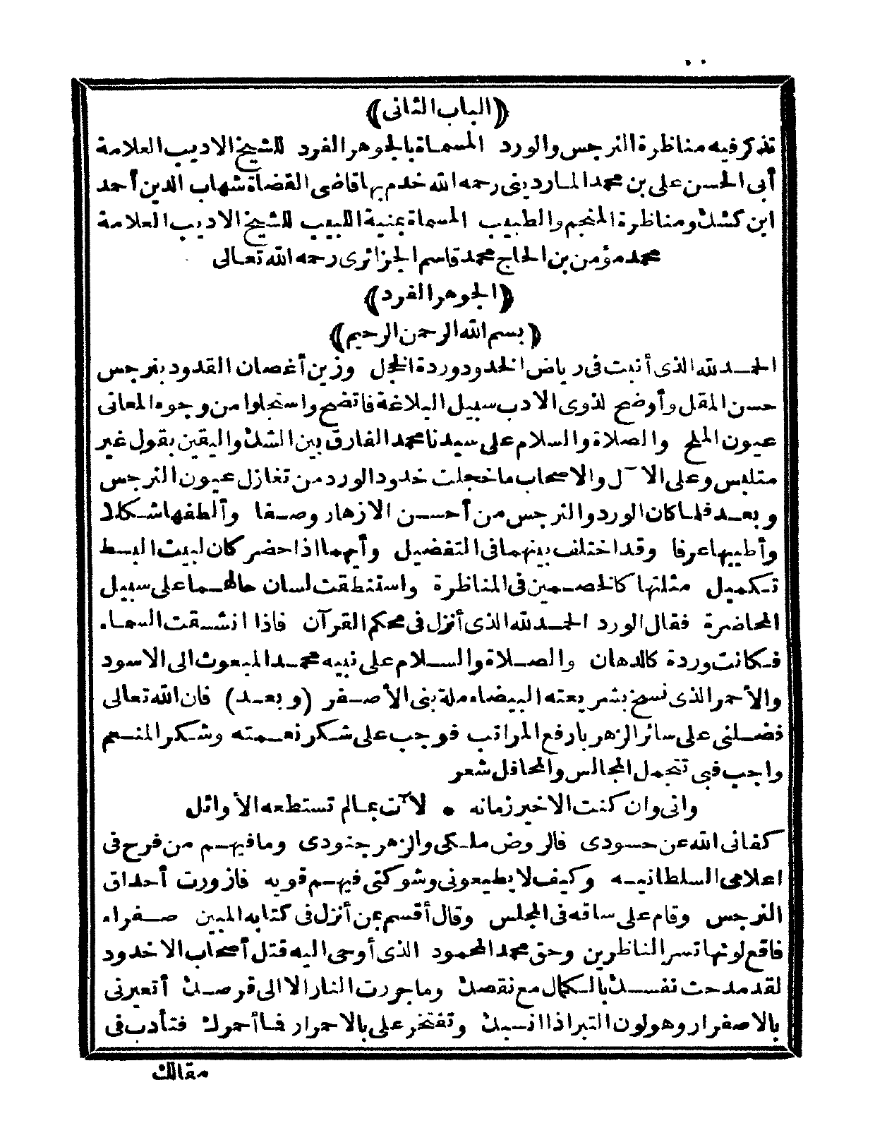 نذكر فيه مناظرة النرجس والورد المسماة بالجوهر الفرد للشيخ الأديب أبي الحسن علي بن محمد المارديني رحمه الله خدم بها قاضي القضاة شهاب الدين أحمد بن كشك ومناظرة المنجم والطبيب المسماة بمنية اللبيب للشيخ الأديب العلامة.