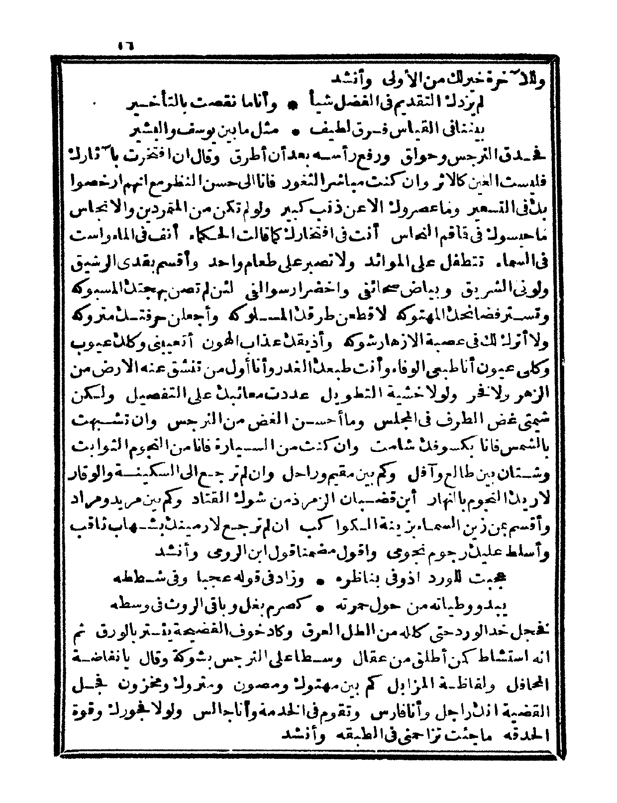 فخجل خد الورد حتى كلله من الطل العرق، وكاد خوف الفضيحة يتستر بالورق، ثم إنه استشاط كمن أطلق من عقال، وسطا على النرجس بشوكه وقال، يا نفاضة المحافل ولفاظة المزابل، كم بين مهتوك ومصون، ومتروك ومخزون، فجلّ القضية أنك راجل وأنا فارس، وتقوم في الخدمة وأنا جالس، ولولا فجورك وقوّة الحدقة ما جئت تزاحمني في الطبقة وأنشد: